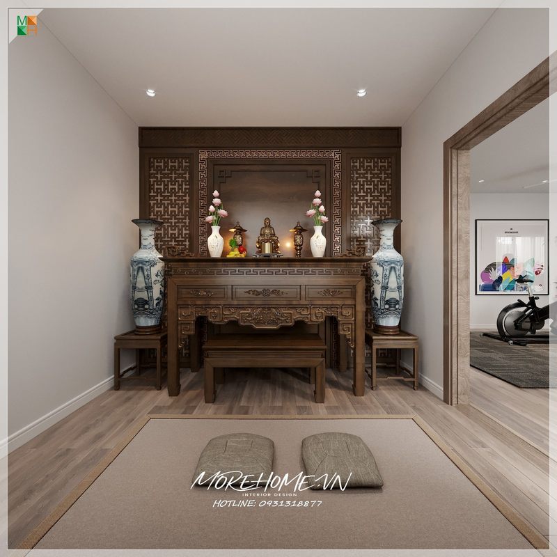 . Bộ bàn thờ gỗ có màu nâu trầm ấm khi đặt trong không gian sẽ tạo nên một cảm giác ấm cúng cho căn phòng thờ.