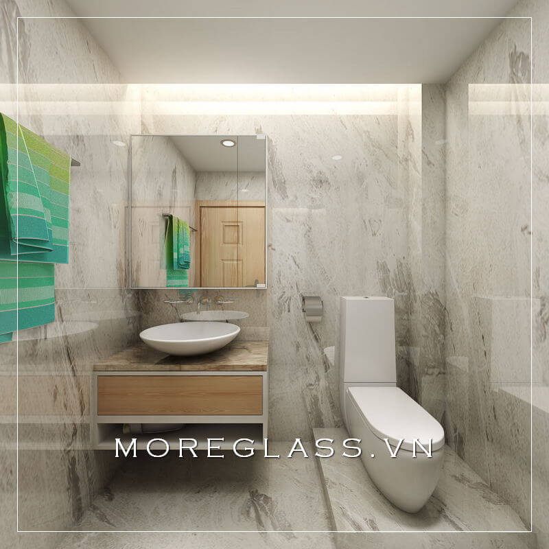 Để tạo cảm giác không gian thoáng rộng hơn, KTS đã chọn đá tự nhiên ốp tường vân mây để thu hút ánh sáng vào phòng tắm.