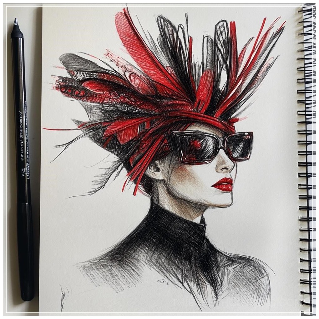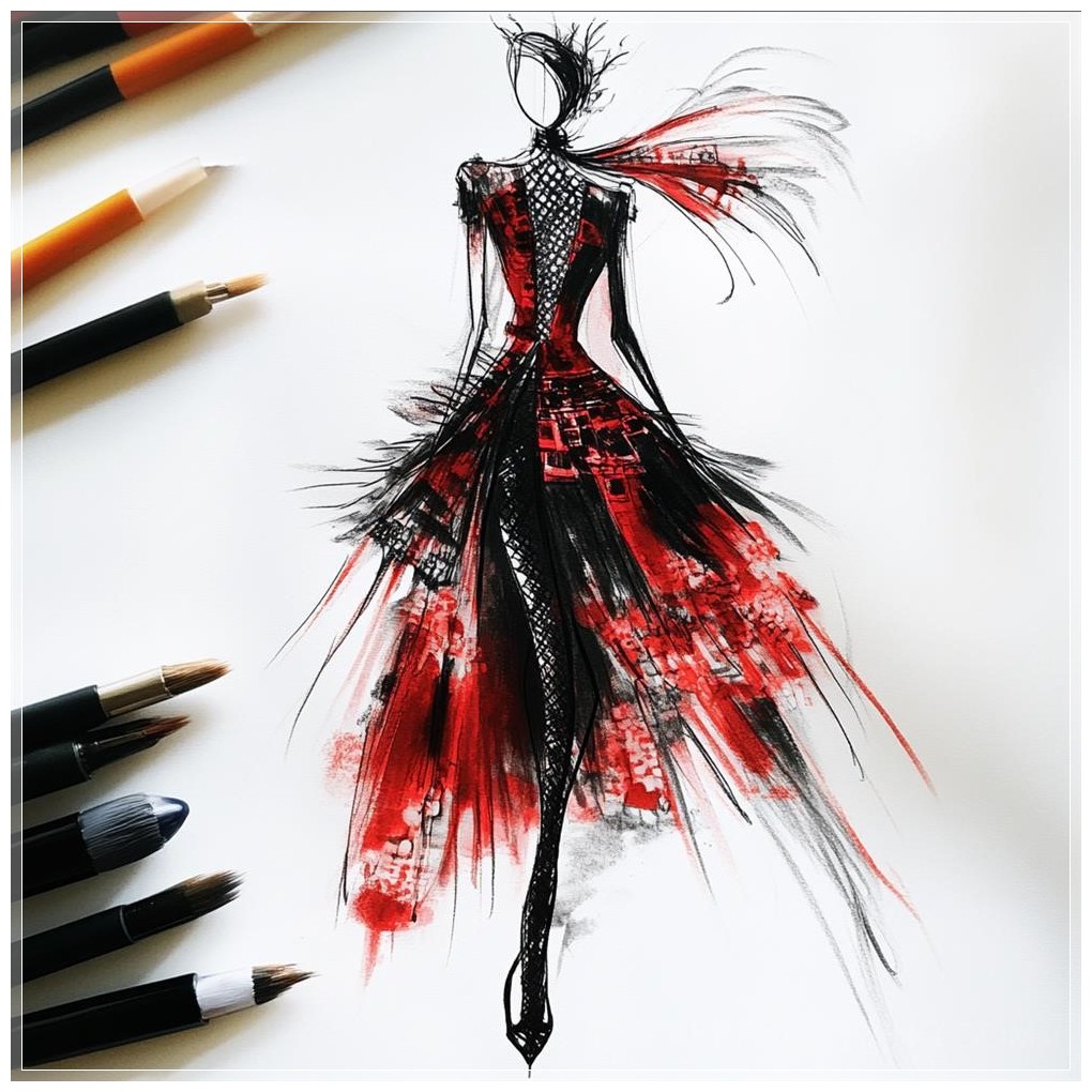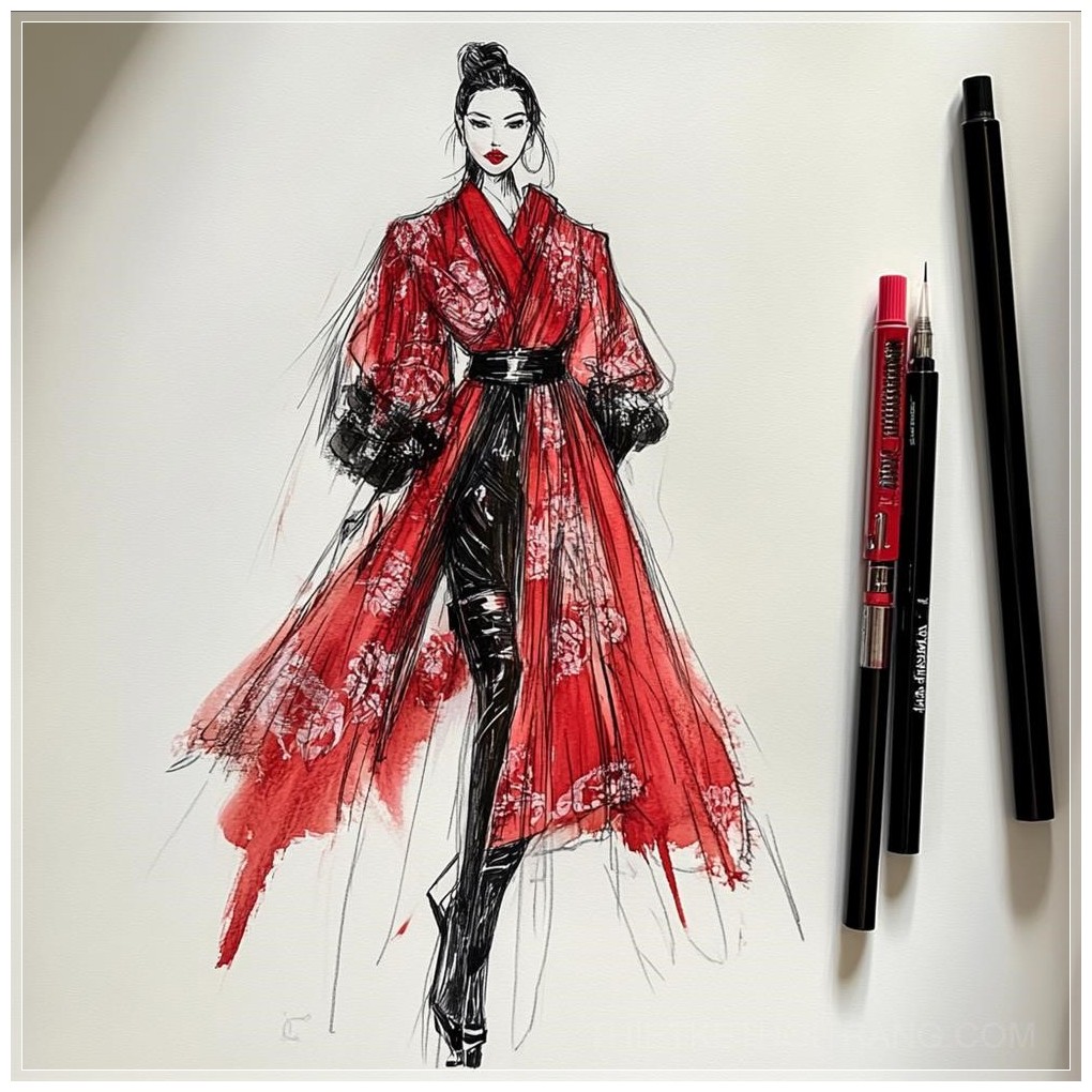 Bản phác thảo thời trang được lấy cảm hứng từ hình ảnh phượng hoàng – biểu tượng của sự tái sinh và quyền lực. Thiết kế toát lên vẻ huyền bí, lộng lẫy với những đường nét uốn lượn mô phỏng đôi cánh rực lửa và màu sắc sống động như lửa cháy.