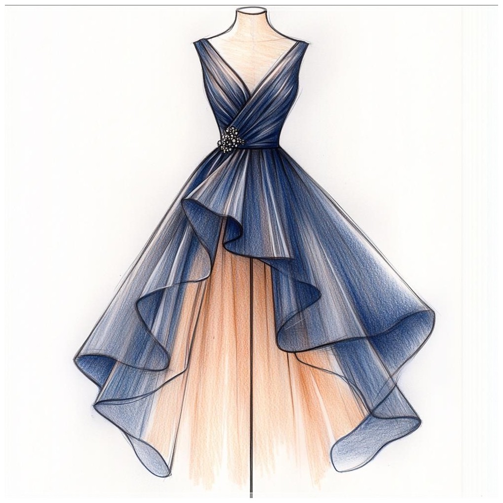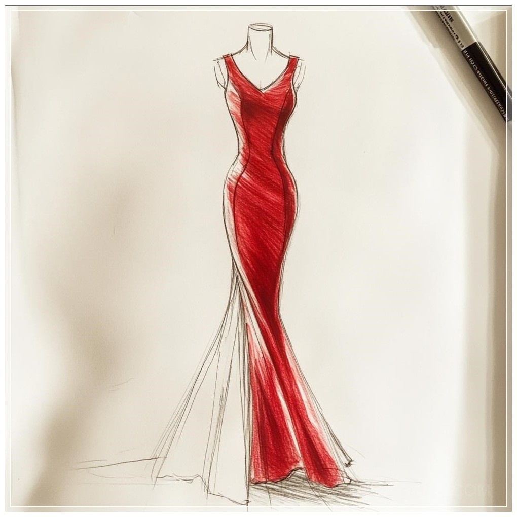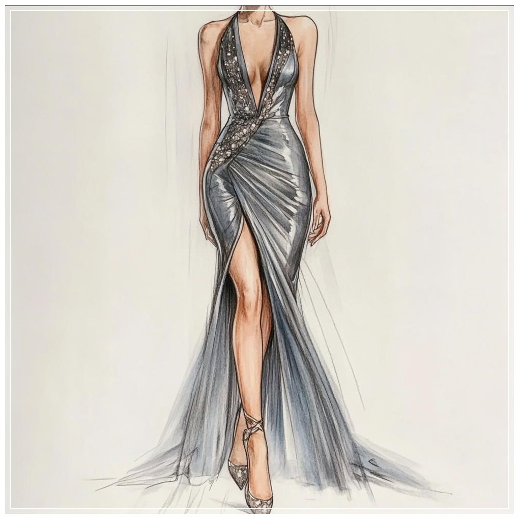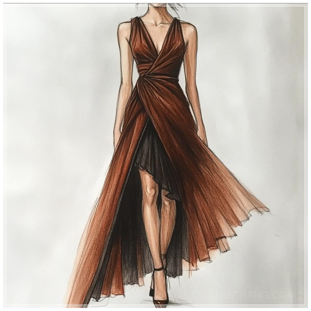 Thiết kế đầm nữ, bản phác thảo sử dụng bút chì màu, thể hiện phong cách sang trọng lặng lẽ, hiện đại, tinh tế, cao cấp và tối giản. Mẫu thiết kế nhấn mạnh sự thanh lịch vượt thời gian, kết hợp giữa nghệ thuật thị giác và thời trang cao cấp trong từng đường nét.
