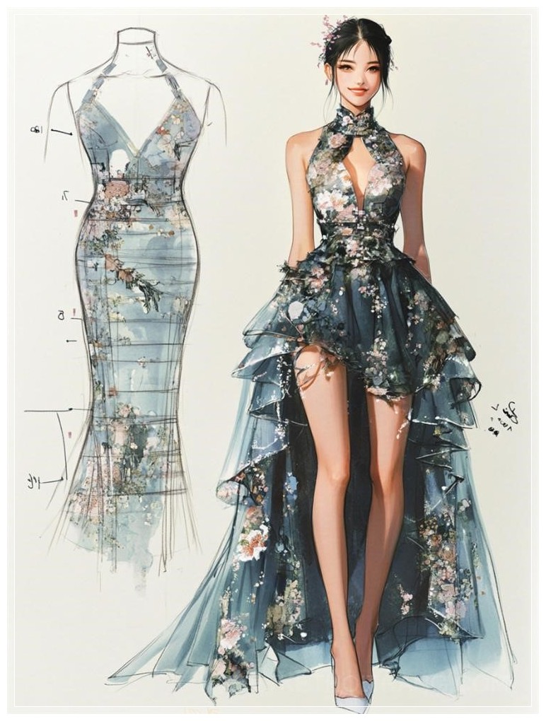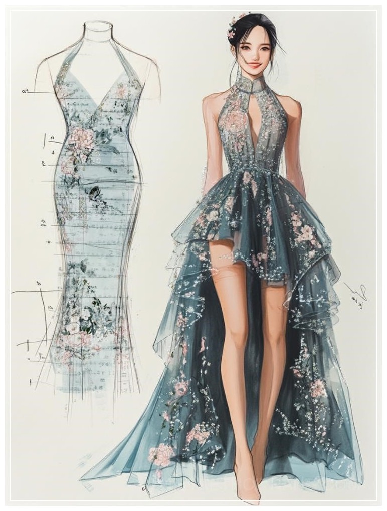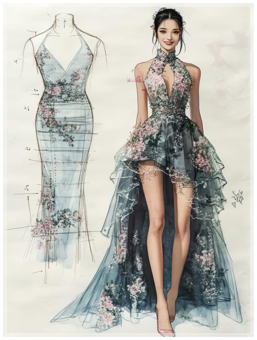 Hình ảnh này thể hiện một thiết kế bao gồm các bản phác thảo tay và mô hình vật lý. Bên trái là bản phác thảo với góc nhìn phía trước và phía sau của một nhân vật nữ mặc váy Trung Hoa hiện đại. Cô có mái tóc đen và khuôn mặt tươi cười. Chiếc váy được thiết kế tinh xảo với chất liệu mỏng nhẹ màu hồng nhạt, trang trí bằng hoa văn và kim tuyến. Váy có chân váy nhiều lớp và cổ cao, tạo cảm giác huyền ảo. Nhân vật đứng duyên dáng, một tay đặt nhẹ lên eo, tay còn lại buông tự nhiên. Nền là khung trắng đơn giản với họa tiết Trung Hoa màu hồng, tạo nên tổng thể mộng mơ và lãng mạn. Bên phải là bản phác thảo chưa hoàn thiện của một chiếc váy với các đường đo và con số.