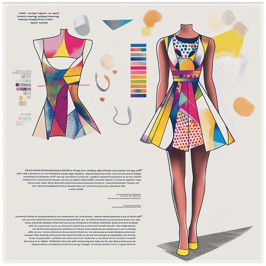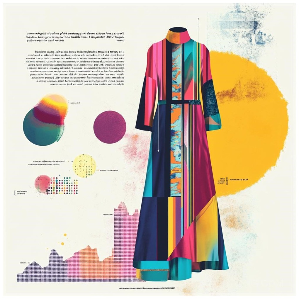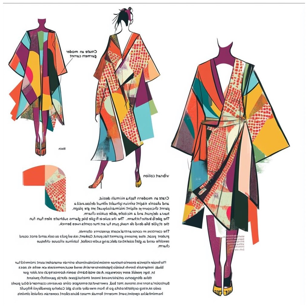 Create an image of a modern fashion garment with bold, vibrant colors and a minimalist yet playful design. The garment should have a sleek and elegant silhouette, incorporating subtle, delicate patterns that add a unique charm. The style blends fun contrasts in a way that exudes simplicity and modern charm. Show the garment from multiple angles--front, side, and back--to showcase the clean lines and creative details. The background should be a muted pop of color with whimsical shapes and forms, adding a sense of joy and playfulness without overpowering the garment's design.