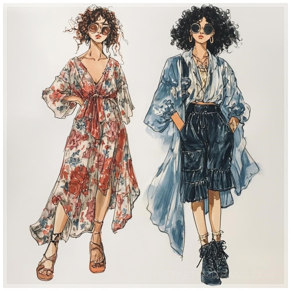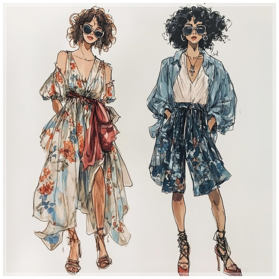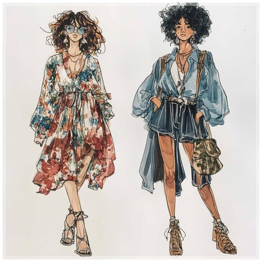 fashion sketch of two outfits for best friends who are adults, mid twenties, outfits that complement each other, one is half-black, curly hair, cool, upscale look with a monochromatic palette while the other is curly-haired Italian, more bohemian, flowly clothing with some structure
