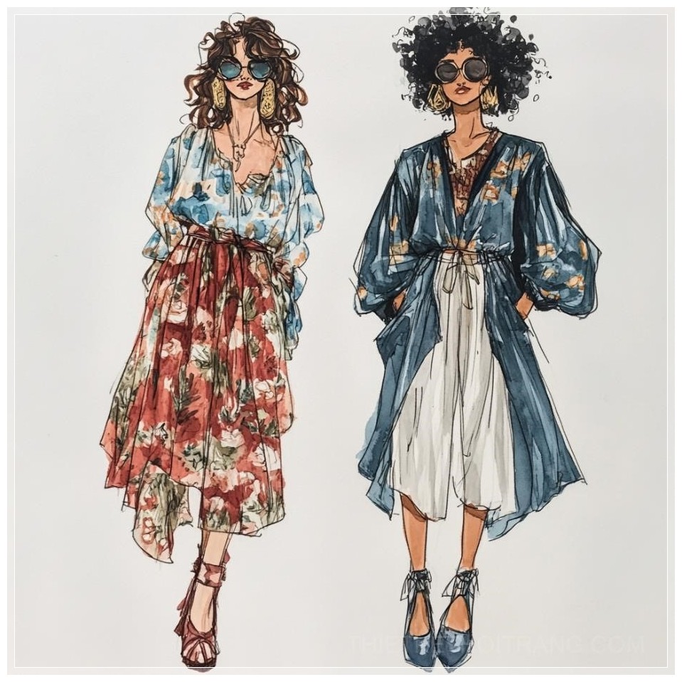 Bản phác thảo thời trang gồm hai bộ trang phục dành cho hai người bạn thân là người lớn ở độ tuổi ngoài hai mươi. Cả hai trang phục đều bổ trợ cho nhau: một người có mái tóc xoăn, da nâu, phong cách sang trọng, hiện đại với bảng màu đơn sắc; người còn lại là người Ý với tóc xoăn, phong cách bohemian nhẹ nhàng nhưng vẫn có cấu trúc rõ ràng trong trang phục.