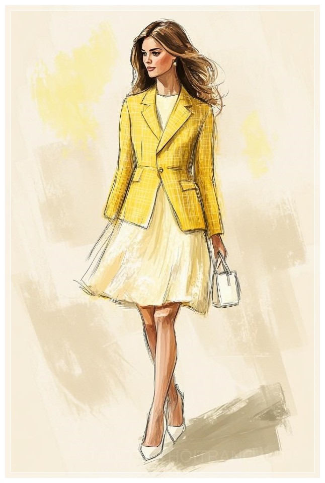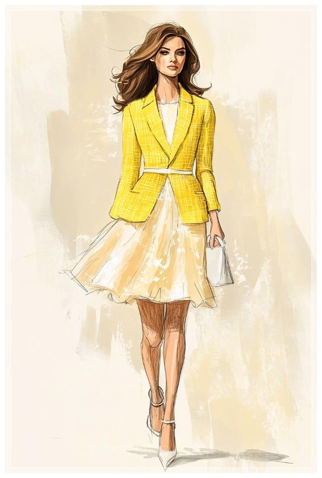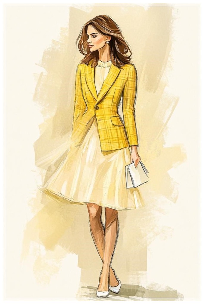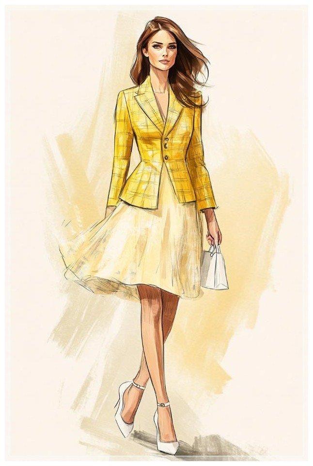 Kate middleton style women with light brown hair half up half down style, wearing a floaty pale yellow dress, with a cropped yellow tweed ladies jacket, holding a small white bag with white heels, sketchy illustration style, fashion illustration style --v 6.1 --ar 2:3