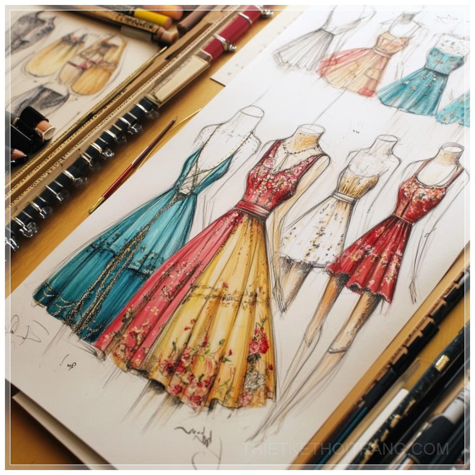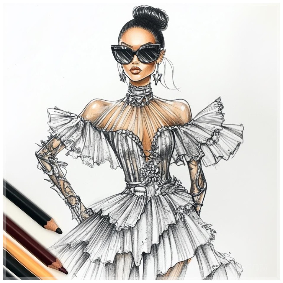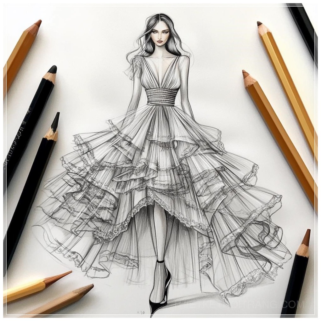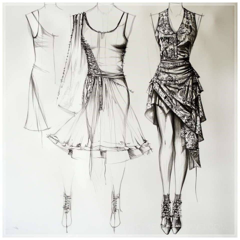 Một bản vẽ thiết kế thời trang tinh tế, thể hiện những ý tưởng sáng tạo và phong cách thời trang hiện đại, với các chi tiết về chất liệu, màu sắc và form dáng độc đáo, mang đến cái nhìn toàn diện về xu hướng thời trang đương đại.