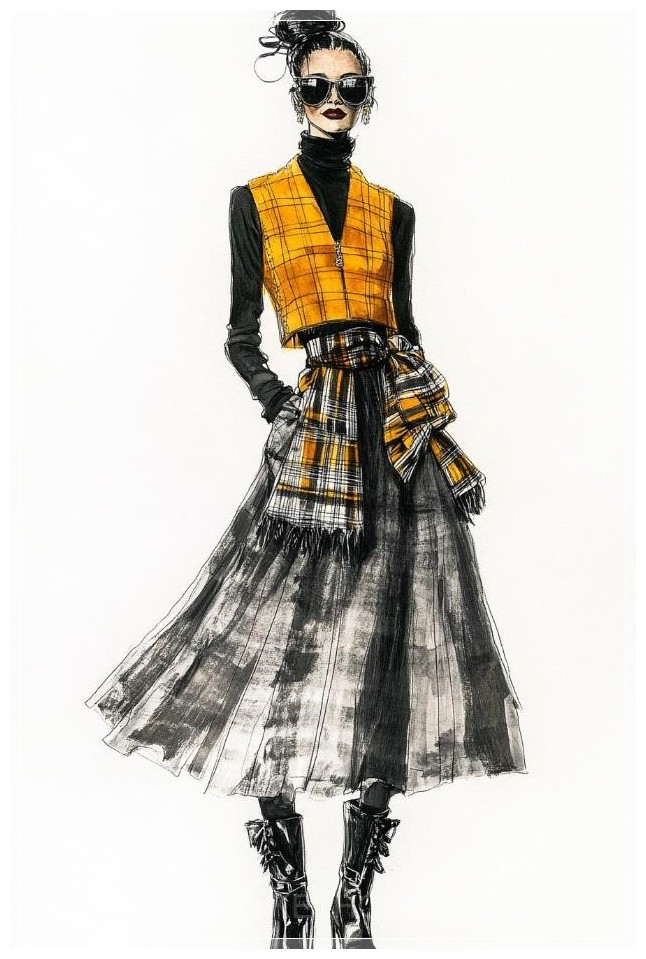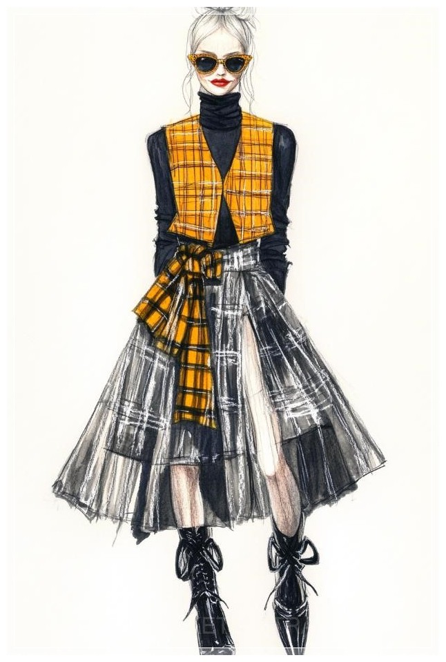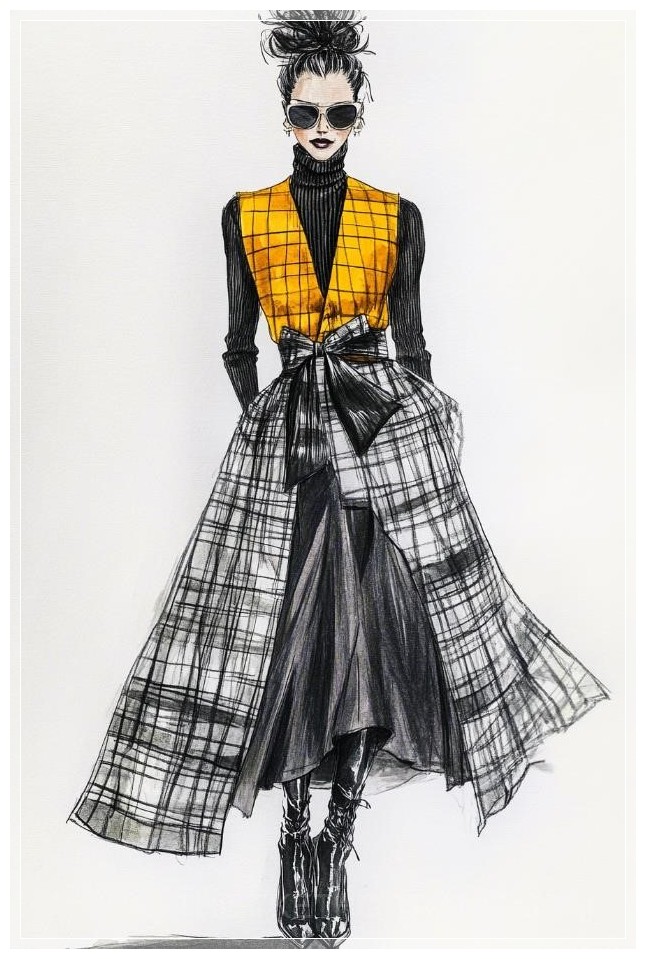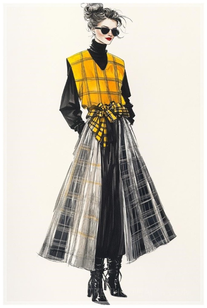 A fashion illustration of an elegant outfit with silver grey long skirt, black turtleneck sweater and plaid yellow vest designed by Vivienne Westwood for women in their late thirties, drawn in pencil style, watercolor and ink pen. The attire includes tall boots with thick soles and a belt made from velvet fabric with large leather bows. It's adorned with geometric patterns on the vest and dress. Her hair is styled up high at her forehead, wearing sunglasses and smiling gently. Full body view. White background. --ar 2:3