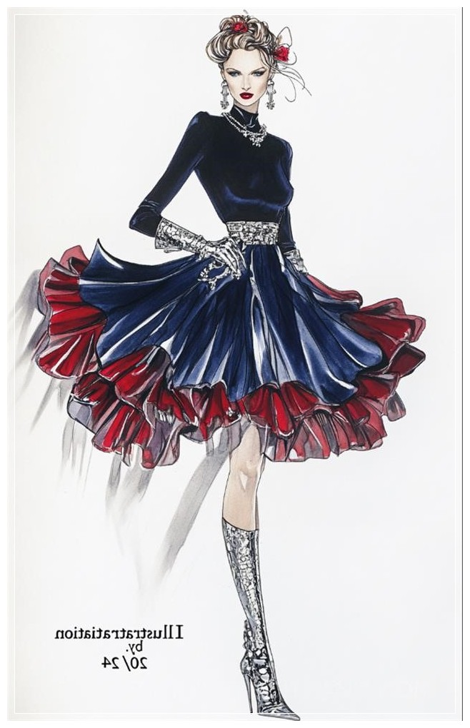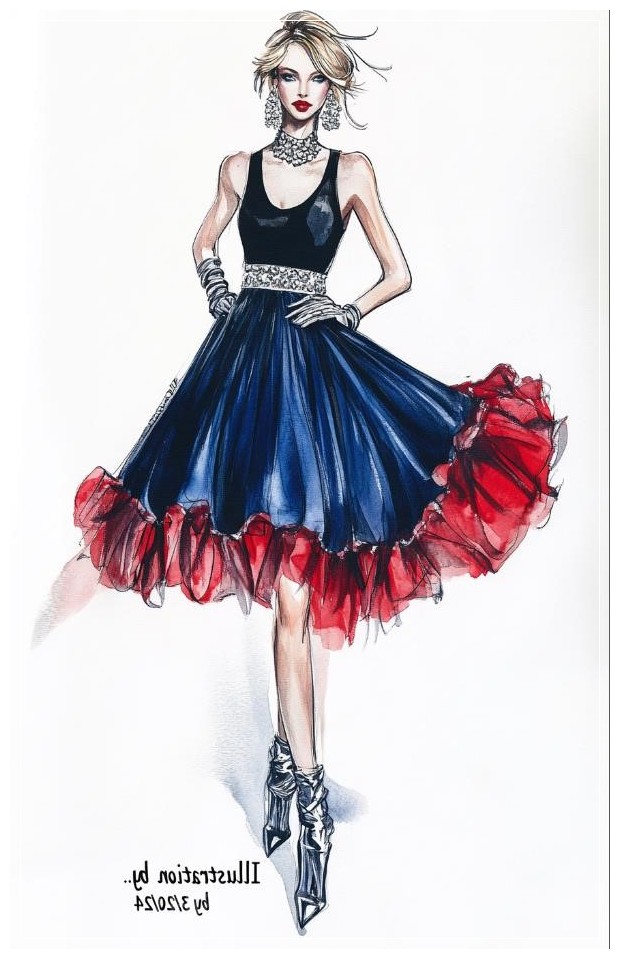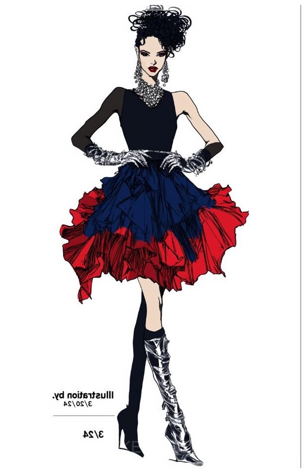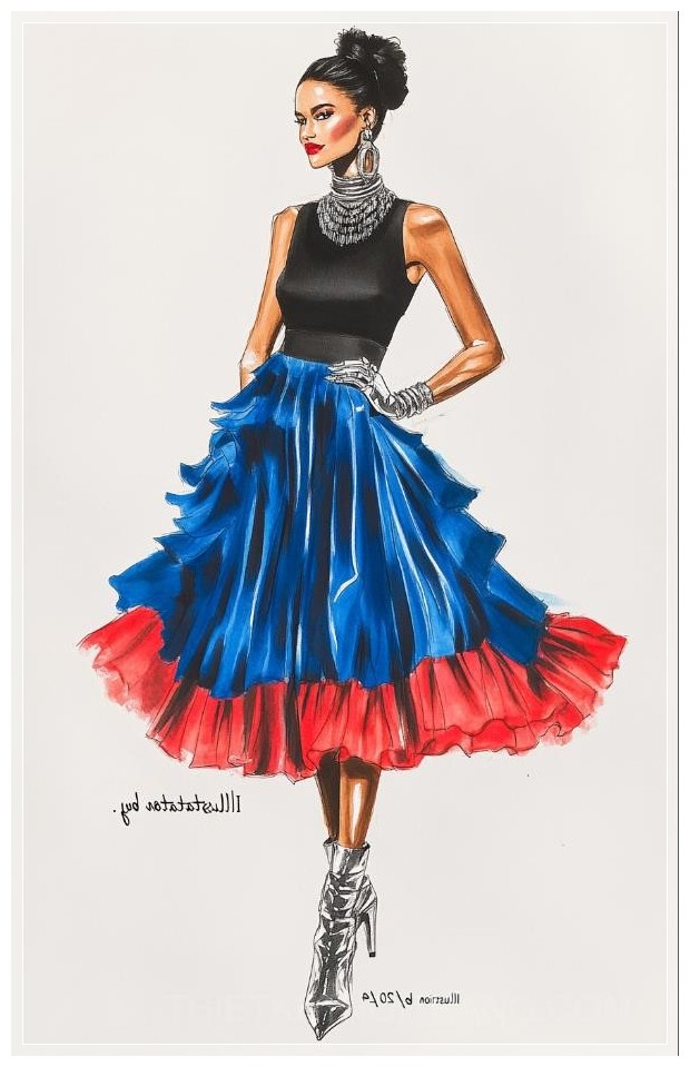 A fashion illustration of a model wearing an elegant blue skirt with red ruffles, a black top, and silver gloves in the style of Illustration by. The outfit is detailed with jewelry and accessories that complement her look. She stands tall in high heels, showcasing both style and comfort for all elements of daily life. The background has a white color tone to highlight the unique style. This design emphasizes sophistication while maintaining functional practicality. The text below it says 3/20/24 in bold letters. --ar 41:64 --s 50 --v 6.1 --style raw