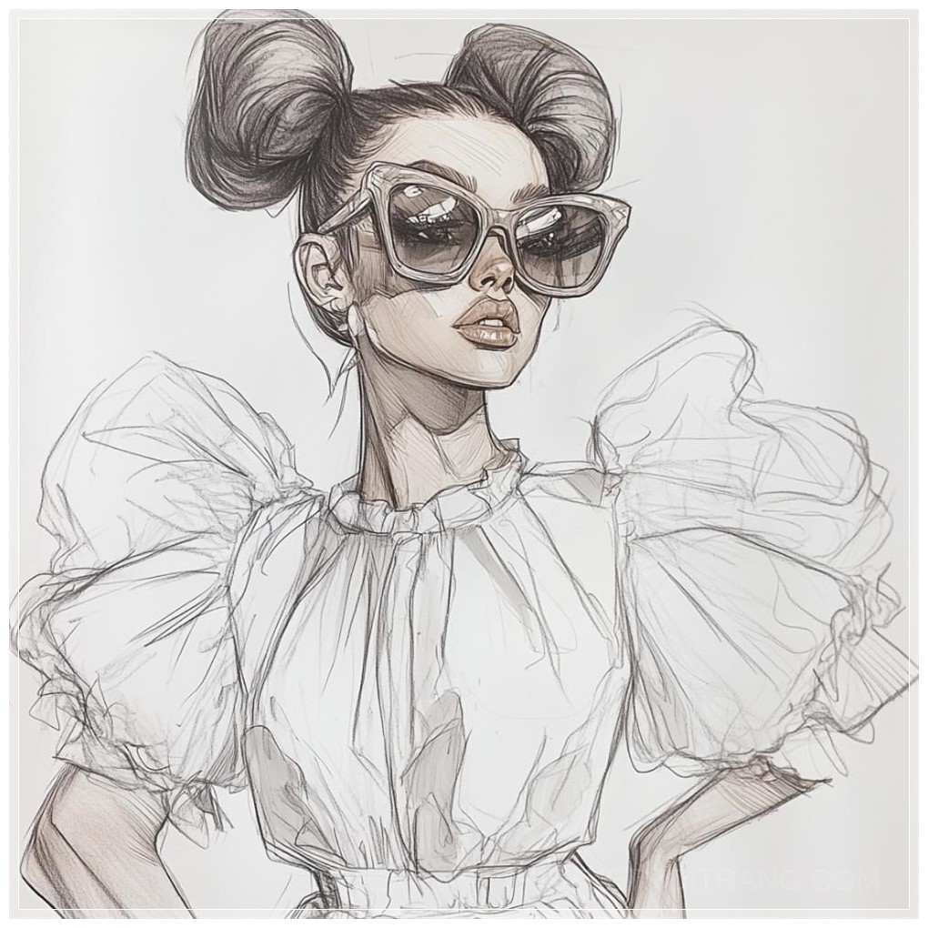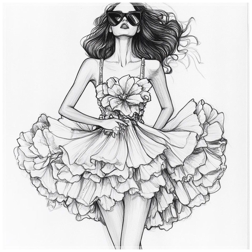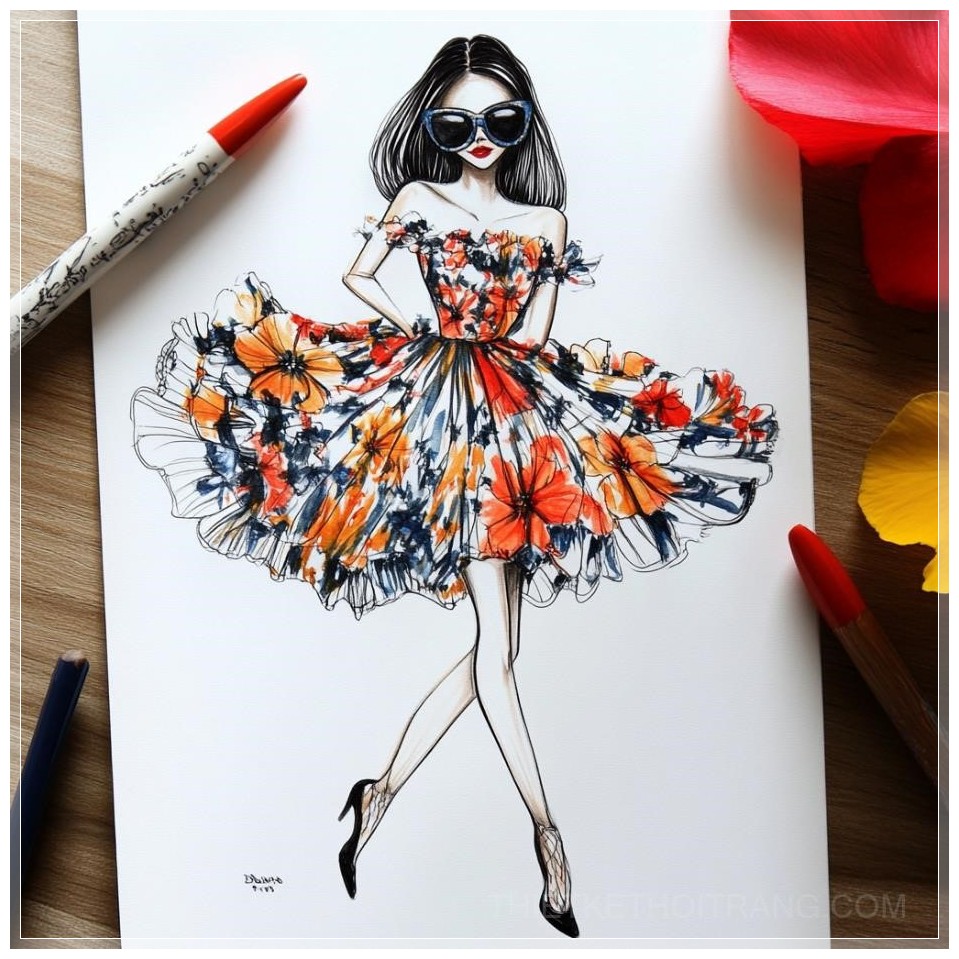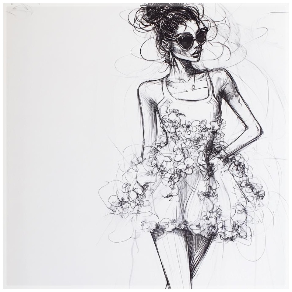 PROMPT: fashion sketches of girl with sunglasses full body posing in a puffy flower dress Ý Nghĩa: Phác thảo thời trang của cô gái đeo kính râm, tạo dáng toàn thân trong một chiếc váy hoa xòe bồng bềnh.