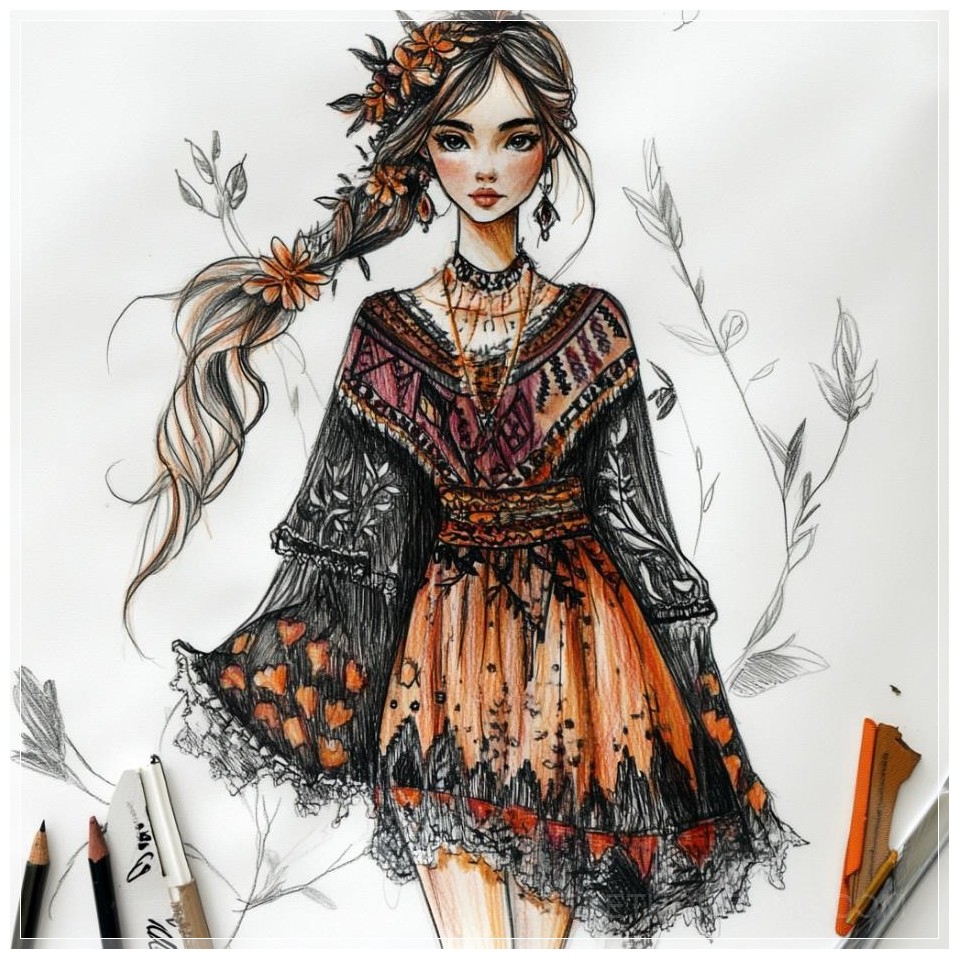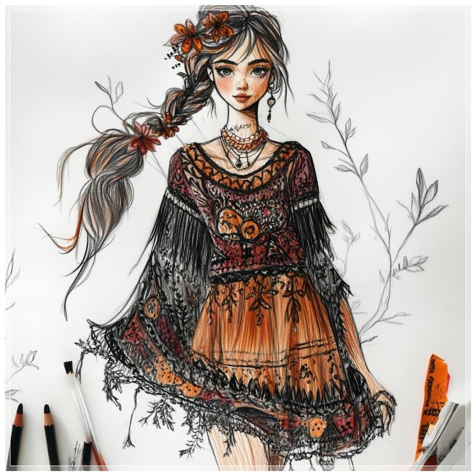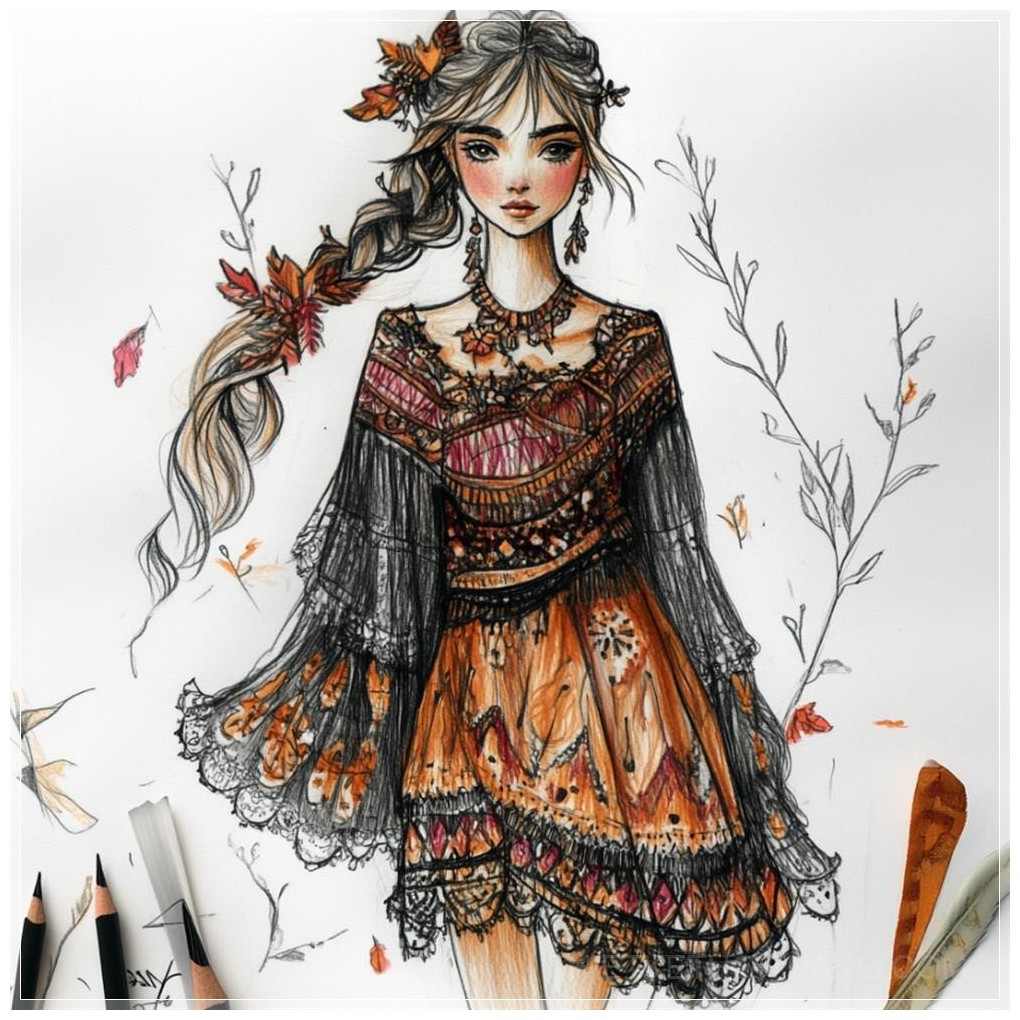 Phác thảo thiết kế thời trang nữ mang phong cách Boho cho mùa thu, với sự kết hợp giữa sự tự do và tinh tế trong các chi tiết trang phục, tạo nên một phong cách nổi bật, đặc trưng của mùa thu.