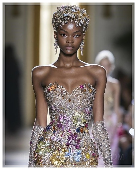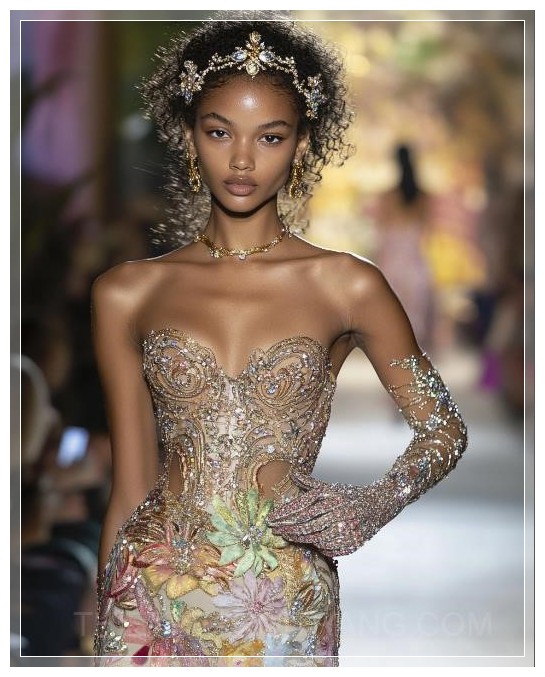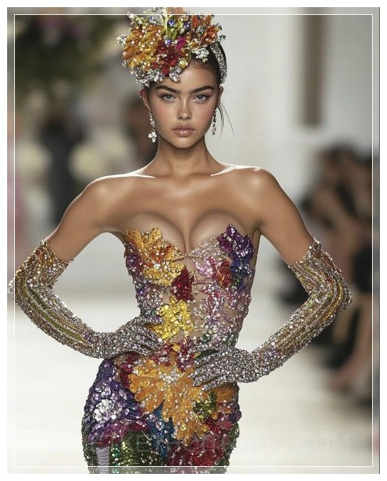 Latina model, wearing a strapless bodysuit and long gloves, fully embellished with gemstones and embroidery. She wears a minimal jeweled headpiece, walking down a runway, brazilian collection, flowers from fabric, detailing crystals, gold colour, taken in the 2025 ƒ/5.0, glitter, asymmetrical, repoussoir, highly detailed, intricate and modern design, Sony Alpha a7 III camera --style raw --ar 4:5 --v 6.1