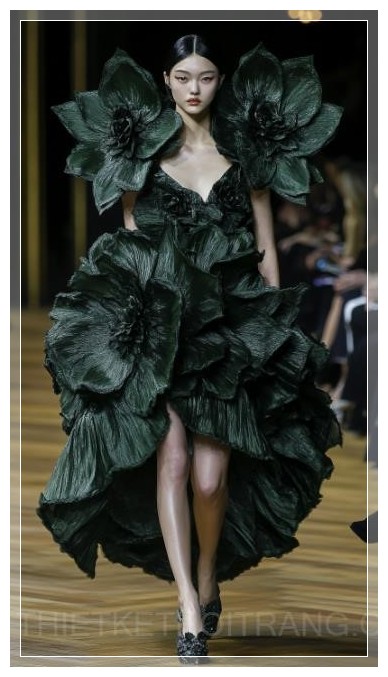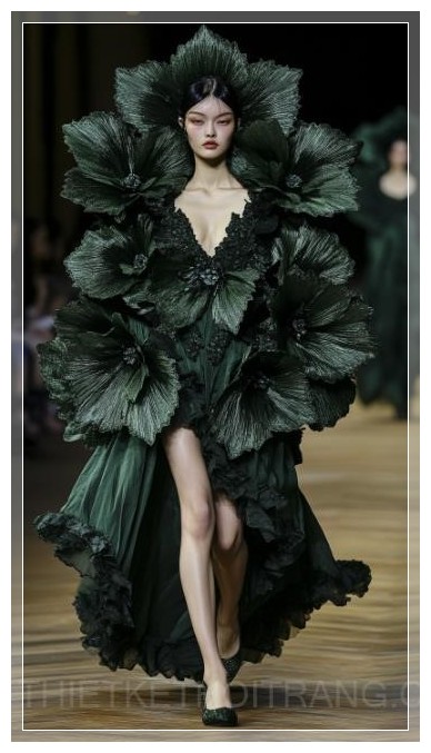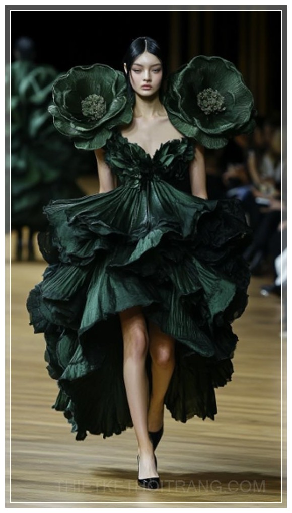 Model wearing an oversized dark green flower dress with giant flowers on the shoulders by Zuhair Murad, full body shot at the Paris Fashion Week runway show --ar 9:16 --v 6.1