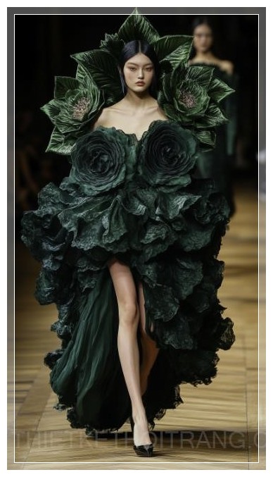 Người mẫu xuất hiện ấn tượng trên sàn diễn Paris Fashion Week trong thiết kế váy hoa oversized màu xanh đậm của Zuhair Murad. Váy được nhấn mạnh bởi những bông hoa khổng lồ đặt trên vai, tạo nên hiệu ứng thị giác mãnh liệt và nghệ thuật. Hình ảnh toàn thân ghi lại khoảnh khắc sải bước đầy tự tin, tôn vinh phong cách thời trang cao cấp mang tính trình diễn mạnh mẽ, đầy sáng tạo và cuốn hút.