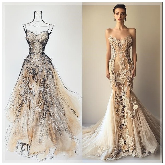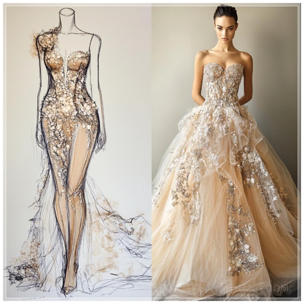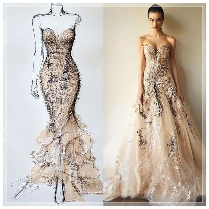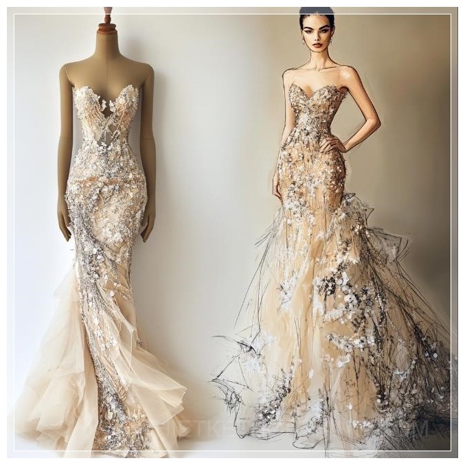 Một phác thảo thiết kế thời trang vẽ tay của một chiếc váy dạ hội với các chi tiết đính hạt và ren. Người mẫu mặc chiếc váy, với các chi tiết và kết cấu tuyệt đẹp. Chiếc váy được làm từ vải tulle màu be, phủ sequin toàn bộ. Bên cạnh phác thảo là một bức ảnh cho thấy mô hình manocanh được sử dụng trong các phác thảo của nhà thiết kế thời trang.