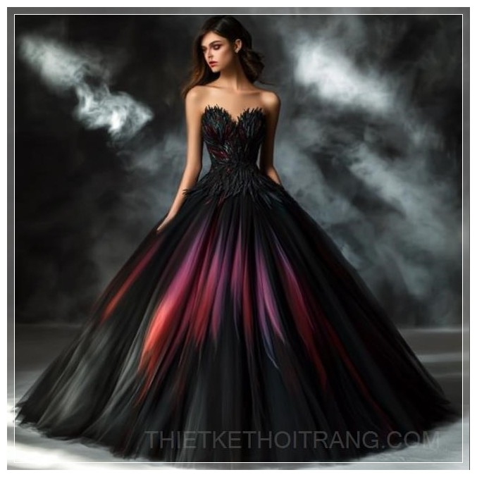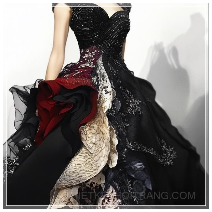 PROMPT: A DRESS THAT SHOWS HOW BLACK FABRIC CAN GO EASLY AND ELEGNTLY WITH OTHER COLORS IN FASHION --v 6.1 Ý Nghĩa: Một chiếc váy thể hiện cách mà vải đen có thể kết hợp dễ dàng và thanh lịch với các màu sắc khác trong thời trang.