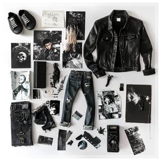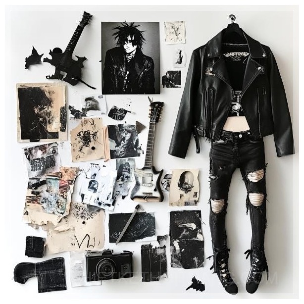 PROMPT: photo realistic mood board for a emo teenager, loves grung music and punk, leather, ripped jeans Ý Nghĩa: Bảng tâm trạng siêu thực cho một thiếu niên emo, yêu thích nhạc grunge và punk, với trang phục da và quần jeans rách.