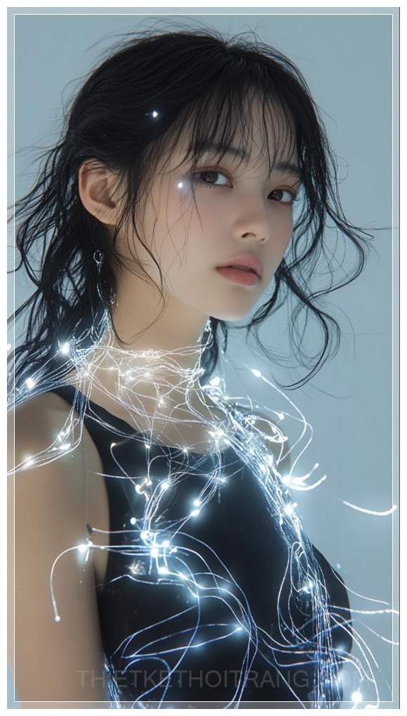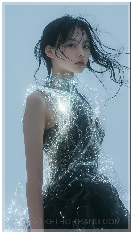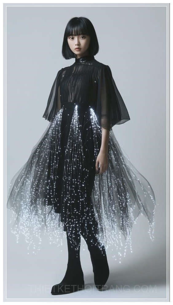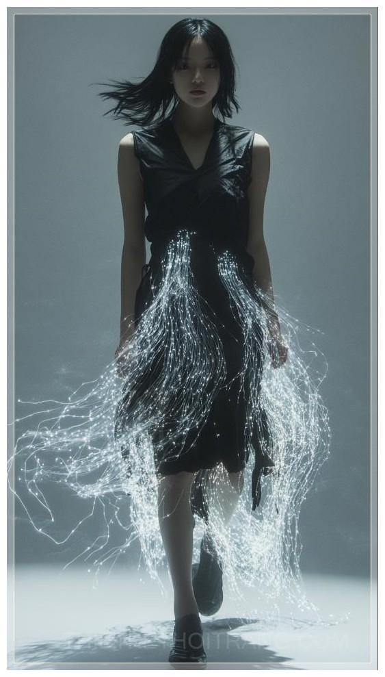 Một người mẫu nữ châu Á 20 tuổi, tóc đen dài vừa, mặc một bộ trang phục cơ bản ôm sát cơ thể màu đen hoặc xám, phủ bên ngoài một chiếc váy hữu cơ, mềm mại làm từ sợi quang. Lớp sợi quang có hình dáng như con sứa, tỏa sáng nhẹ nhàng ở một số khu vực, tạo ra hiệu ứng tương lai và huyền bí. Bức ảnh nhấn mạnh một shot toàn thân của người mẫu, với ánh sáng kịch tính và kết cấu tinh tế, mang phong cách giống như Vogue.