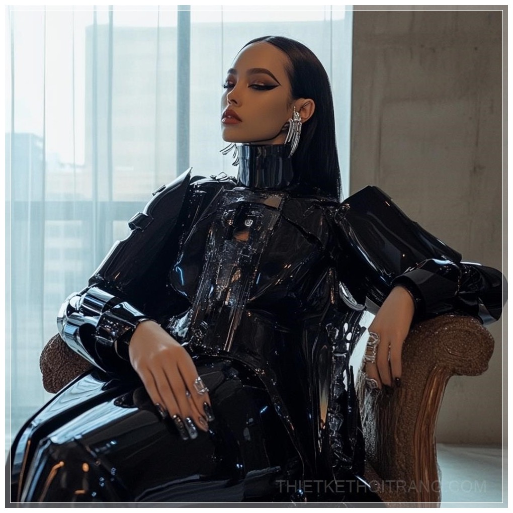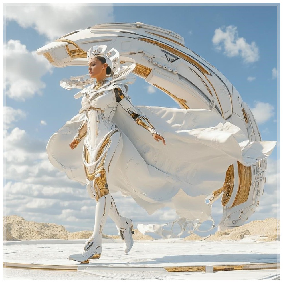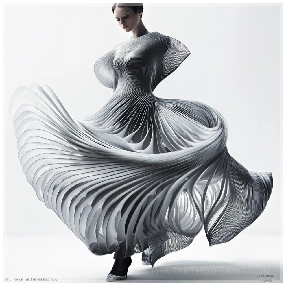 PROMPT: flowing, futuristic fashion on lady --chaos 10 --v 6.1 Ý Nghĩa: Một bộ trang phục tương lai, mềm mại, bay bổng, mang đến vẻ đẹp hiện đại và cuốn hút, tôn lên vẻ đẹp của người phụ nữ.