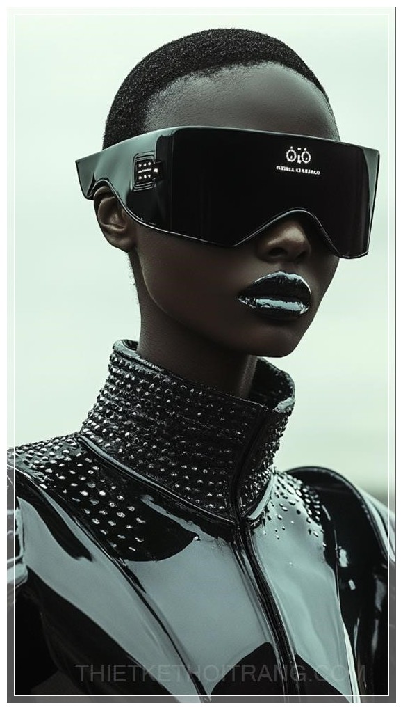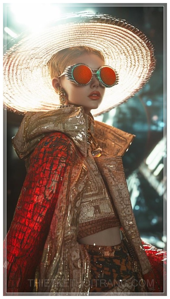 PROMPT: Future Chanel style fashion runway. From. Head to toe. A model is posing. --ar 9:16 Ý Nghĩa: Một người mẫu đang tạo dáng trên sàn diễn thời trang phong cách Chanel tương lai, từ đầu đến chân.