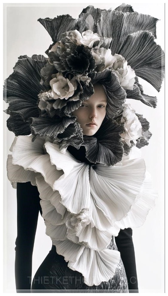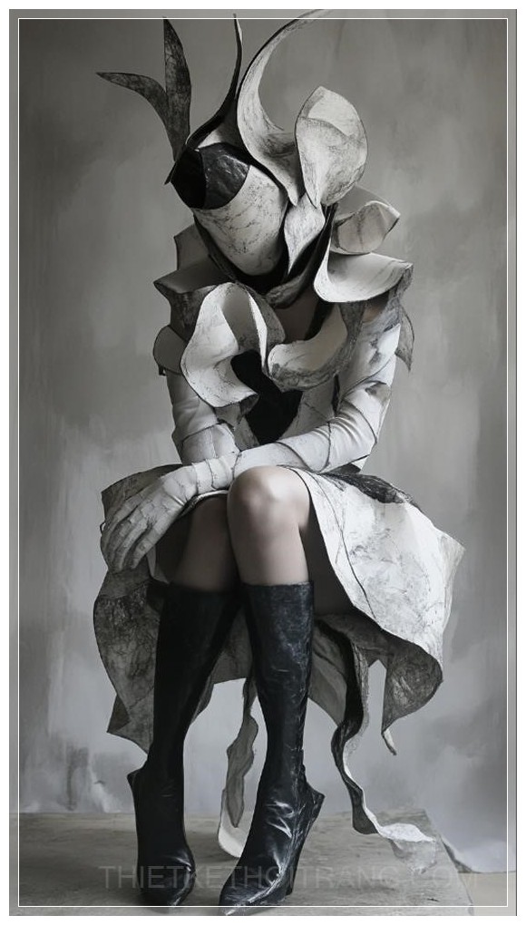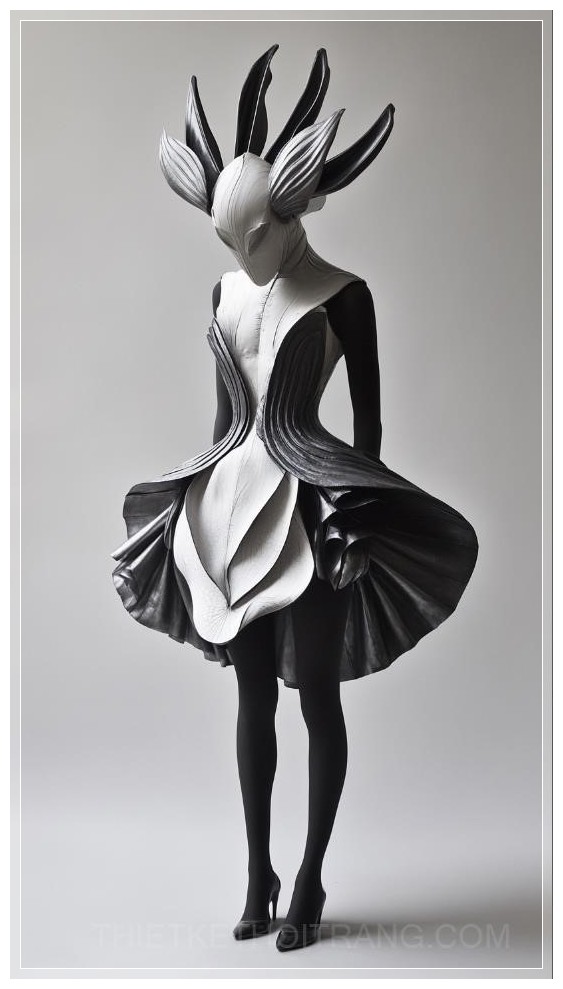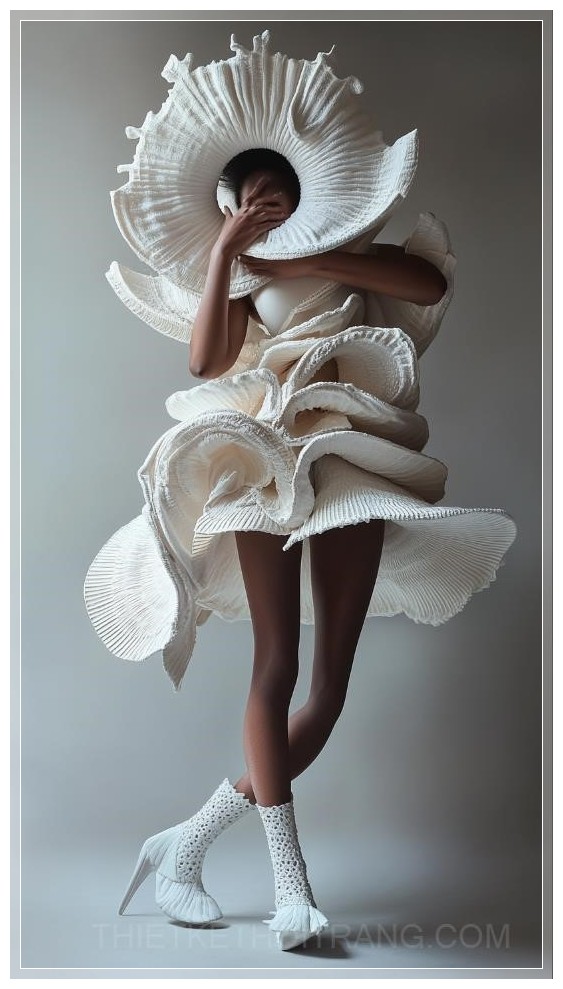 Công việc thời trang tiên phong thường có kích thước lớn và mang tính điêu khắc, sử dụng hình dạng và cấu trúc để biến cơ thể thành một thứ gì đó không thể nhận diện và mang tính siêu thực, do Grace DuVal thực hiện.