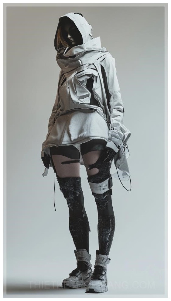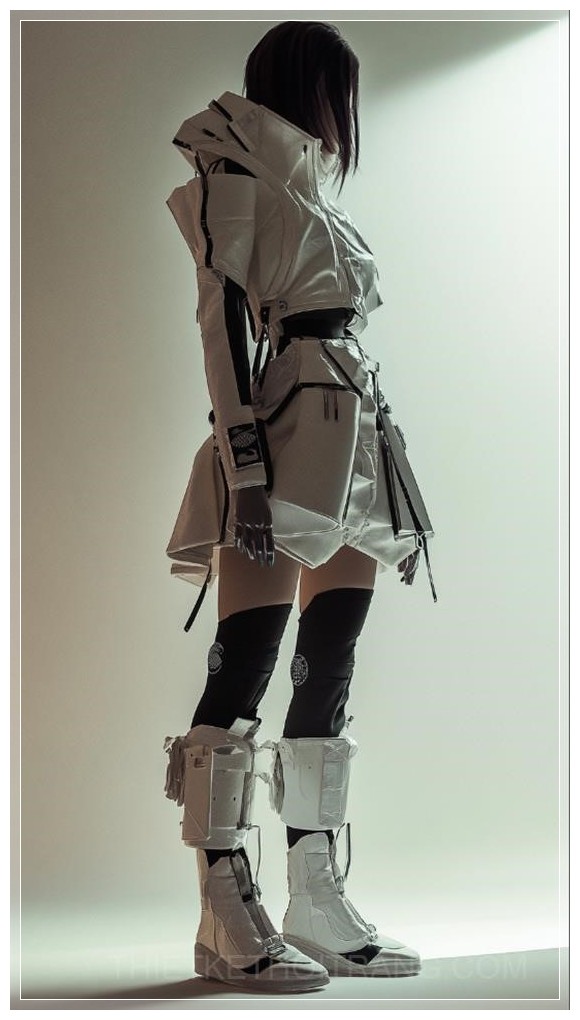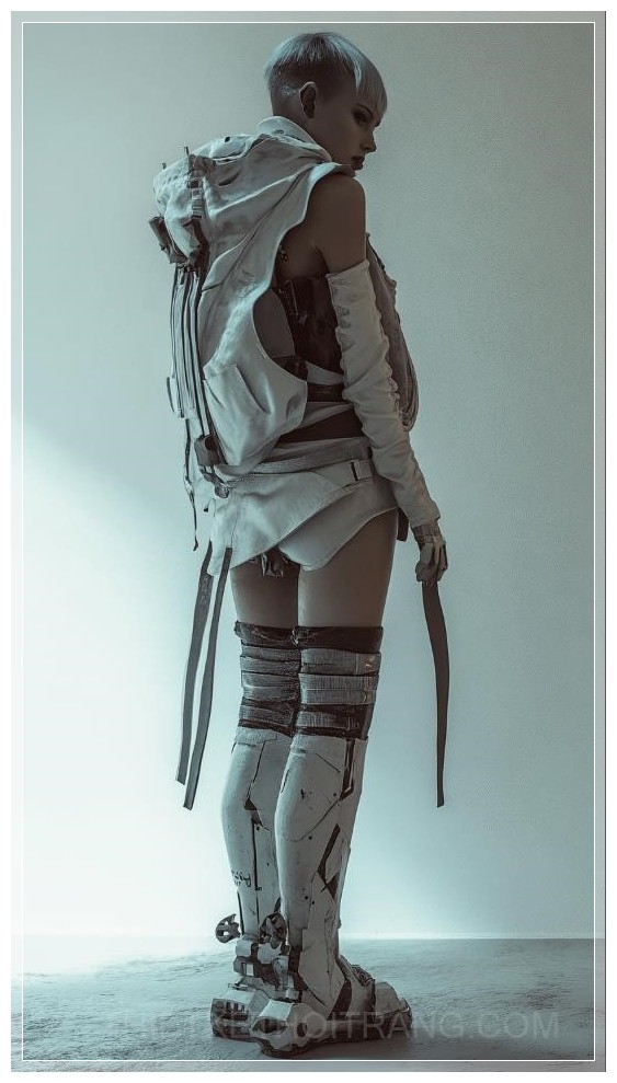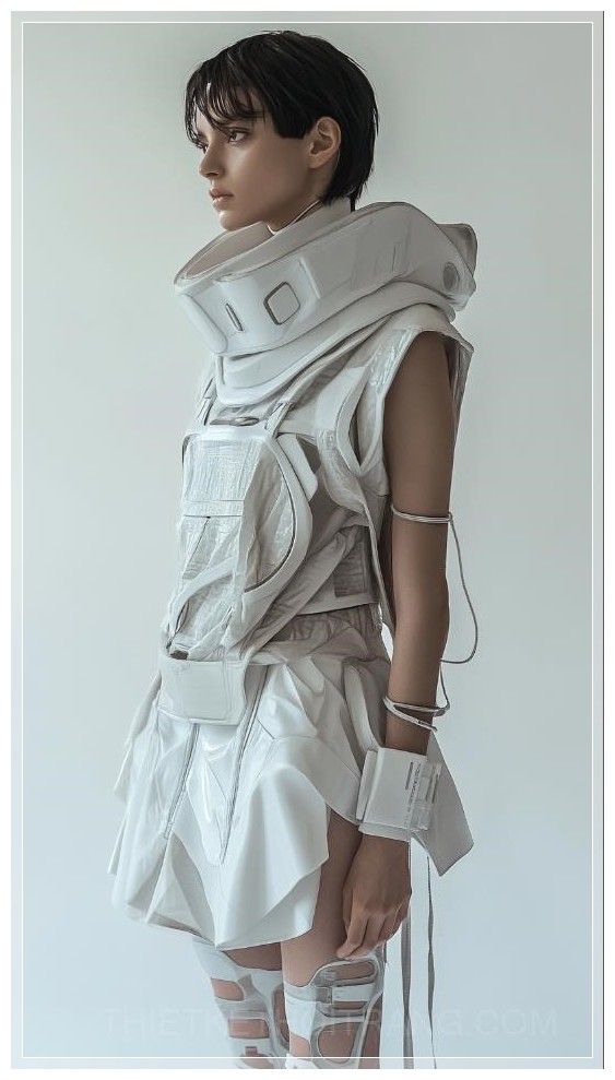 Một người mẫu thời trang nữ mặc trang phục phong cách tương lai, tóc ngắn, có vẻ ngoài cybernetic và grotesque, với thiết kế tối giản, váy có kết cấu đua.
