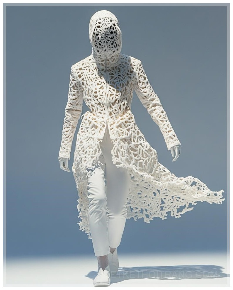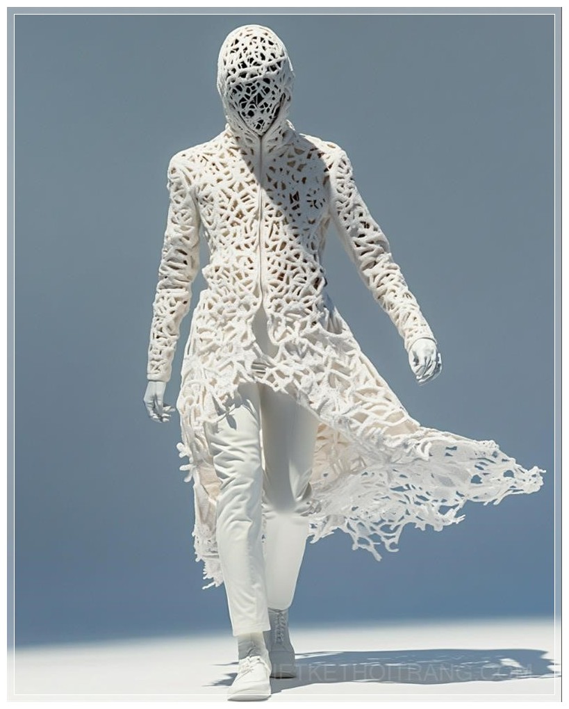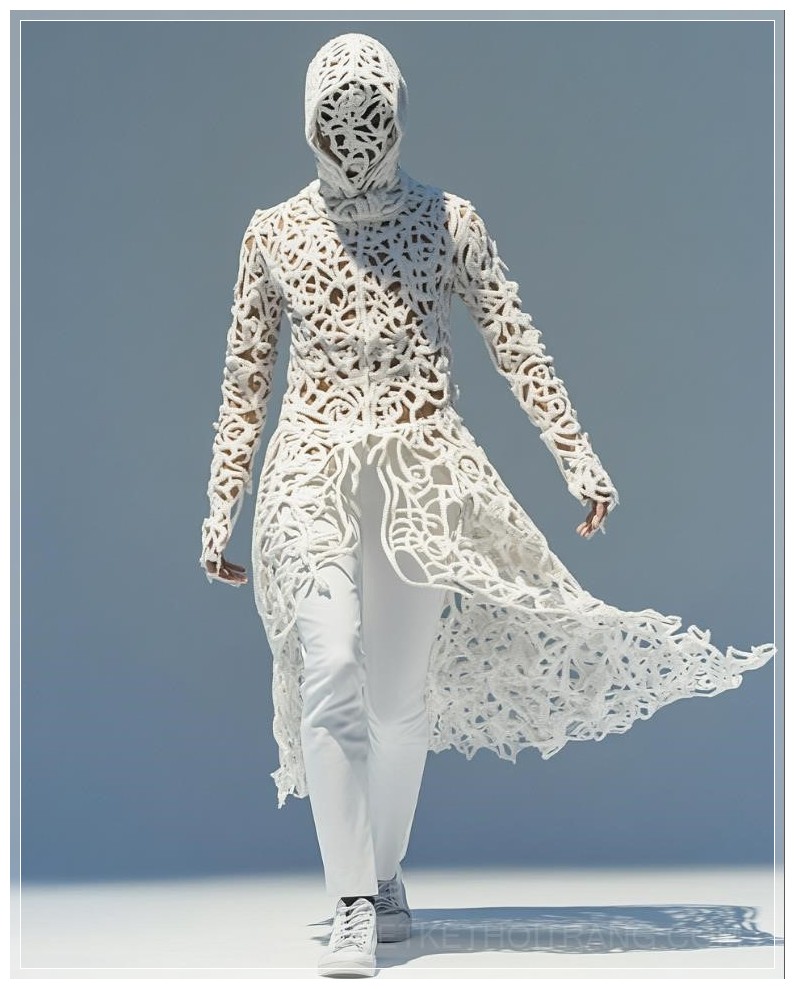 Một bức ảnh thời trang với hình dáng cơ thể được tạo thành từ các họa tiết hình học Hồi giáo phức tạp, với thiết kế chính xác mang lại cảm giác cân bằng và hài hòa, nền trắng đơn giản.