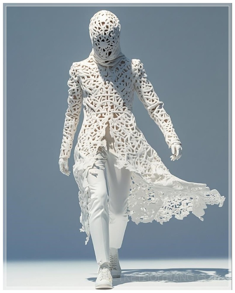 wide shot, A fashion shot of a figure's body formed by intricate Islamic geometric patterns, the precise designs creating a sense of balance and harmony, single white background --chaos 10 --ar 4:5 --style raw --personalize 2ags2u5 6bq98fn --stylize 400 --v 6.1