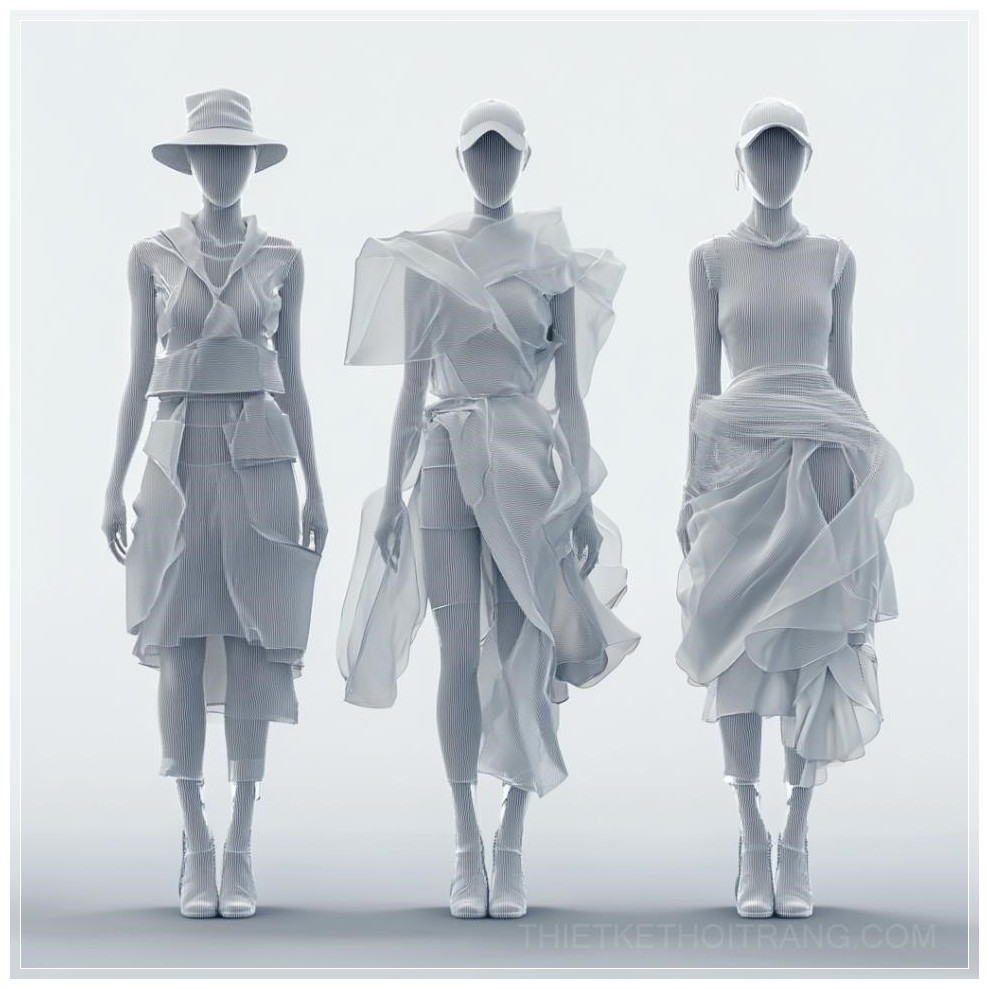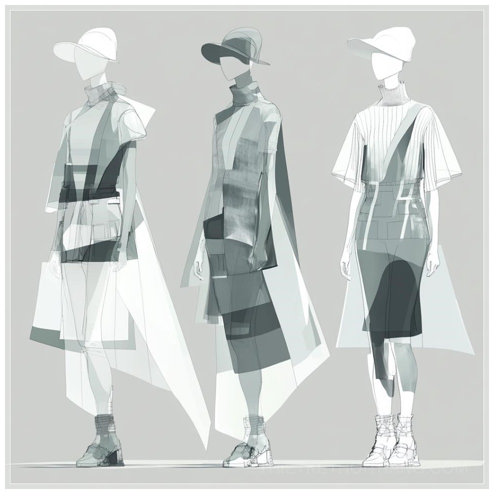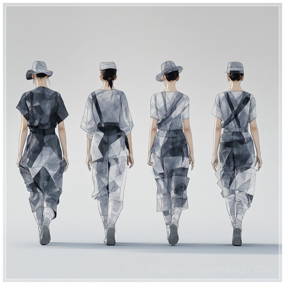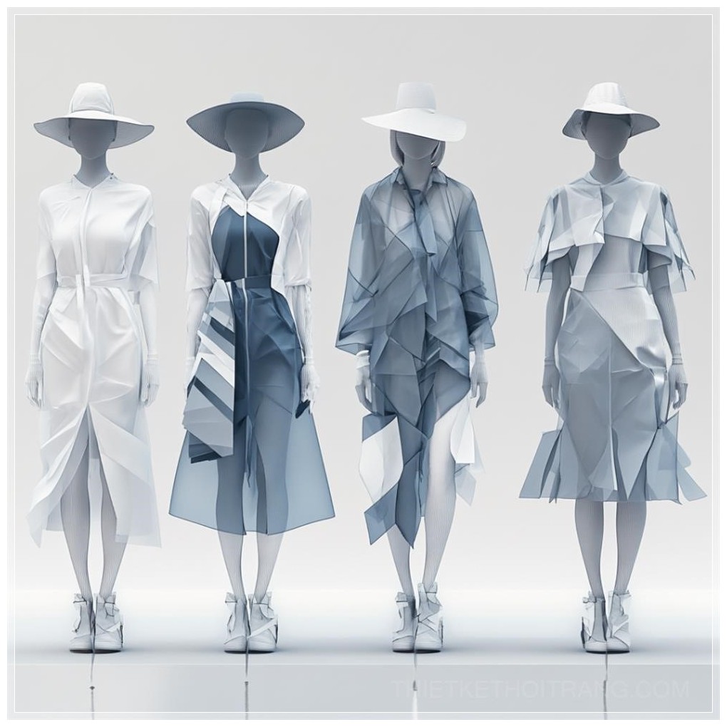 Bản vẽ thiết kế bộ sưu tập trang phục nữ gồm 4 bộ trang phục sử dụng vải silicone sinh học với họa tiết trừu tượng màu xám xanh trong suốt. 4 phong cách trang phục nữ với sự khác biệt về độ dài, phụ nữ mặc trang phục đơn giản với các độ dài khác nhau, trang phục tối giản, phong cách của Royal College of Art London và Central Saint Martins, 5 phụ nữ đội mũ và phụ kiện, mặc trang phục lông thời trang có độ dài khác nhau, với màu xám và trắng là tông màu chính.