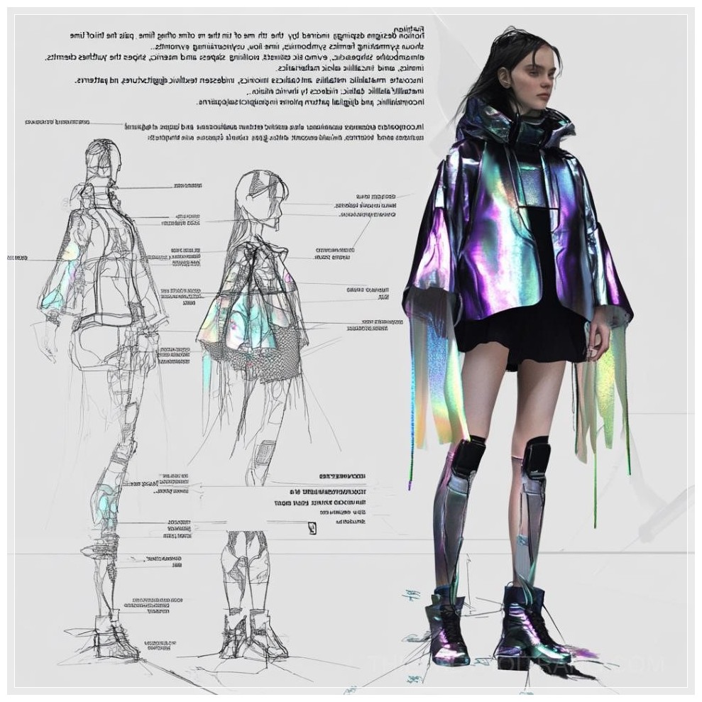 Fashion design inspired by the theme of time passing, incorporating futuristic elements. The clothes should symbolize the flow of time, using dynamic, evolving shapes and materials. Incorporate metallic fabrics, iridescent textures, and digital patterns that evoke the passage of time. Create a sense of both fast and slow movement through asymmetry, layered fabrics, and innovative silhouettes. Add hints of technology with elements like glowing details or holographic effects. The overall design should feel sleek, modern, and avant-garde with a sci-fi influence, while expressing the fleeting nature of time.