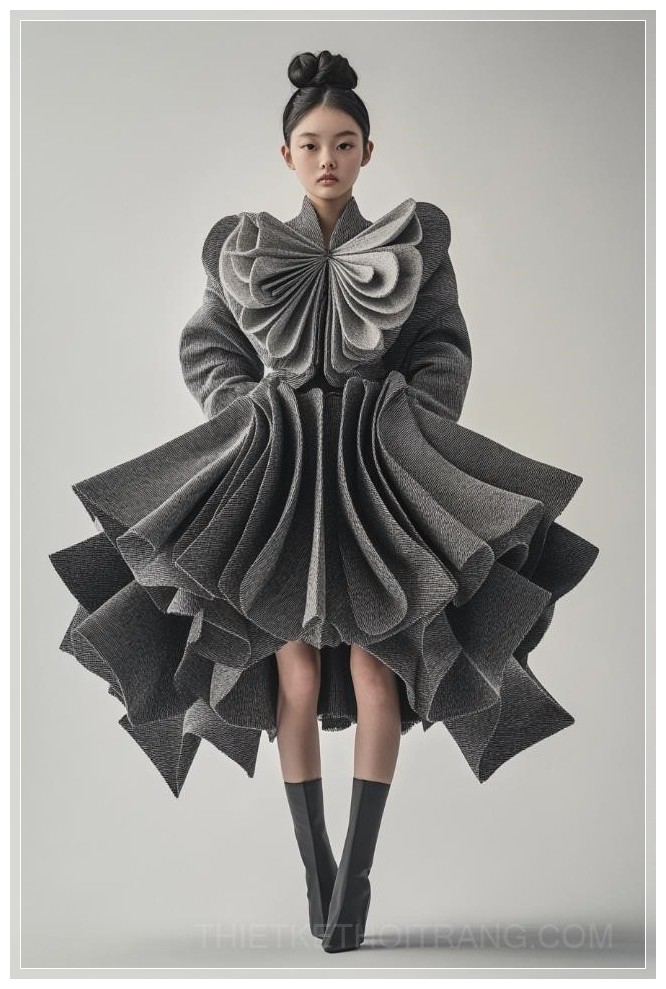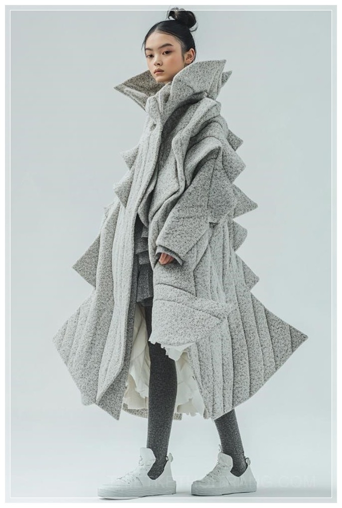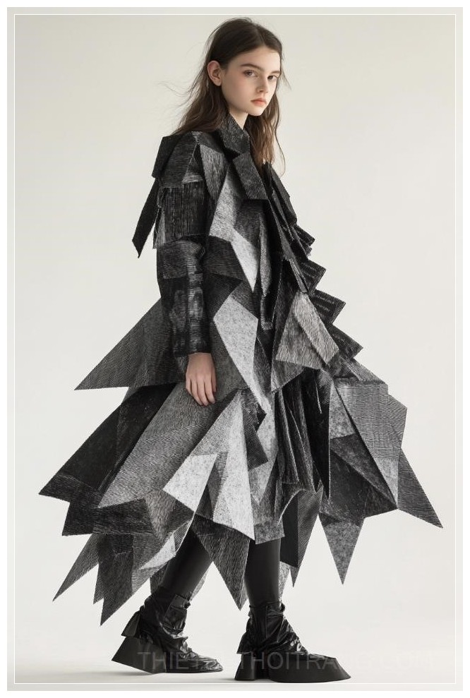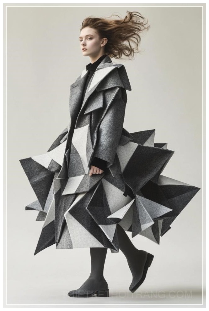 Một bức ảnh thời trang đầy nghệ thuật của một người mẫu nữ tuổi teen, mặc áo khoác và váy haute couture làm từ các tấm vải nỉ mềm, faceted, thiết kế của Issey Miyake và Bao Bao. Bức ảnh được chụp với độ chi tiết tuyệt vời, sử dụng ống kính 85mm, ánh sáng tán xạ từ phía sau, kết hợp với kỹ thuật chụp ảnh chuyên nghiệp và tỉ mỉ. Chụp trong điều kiện ánh sáng thấp, có độ sắc nét cao, và nổi bật sự đối xứng của khuôn mặt model, với thông số kỹ thuật bao gồm độ phân giải 30 megapixel, 4K, khẩu độ f/8, và tốc độ chụp 1/125.