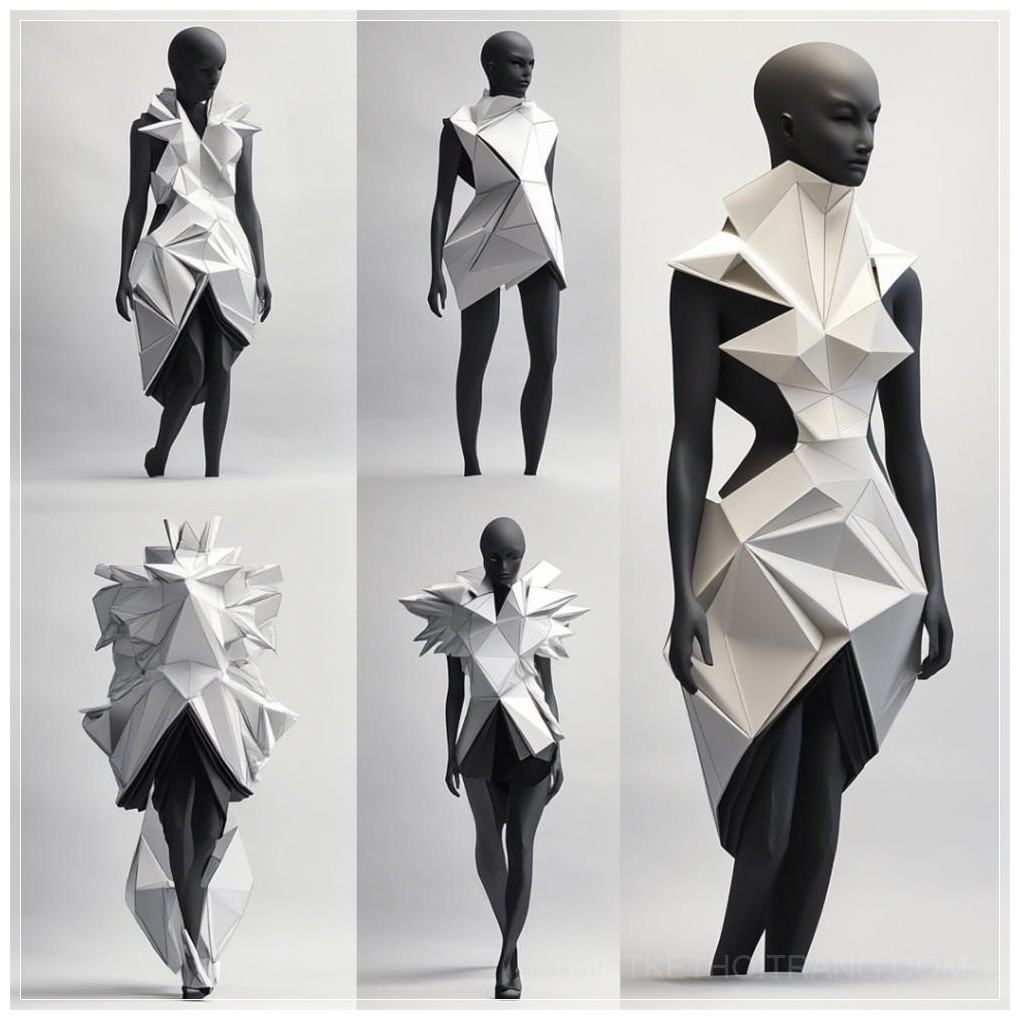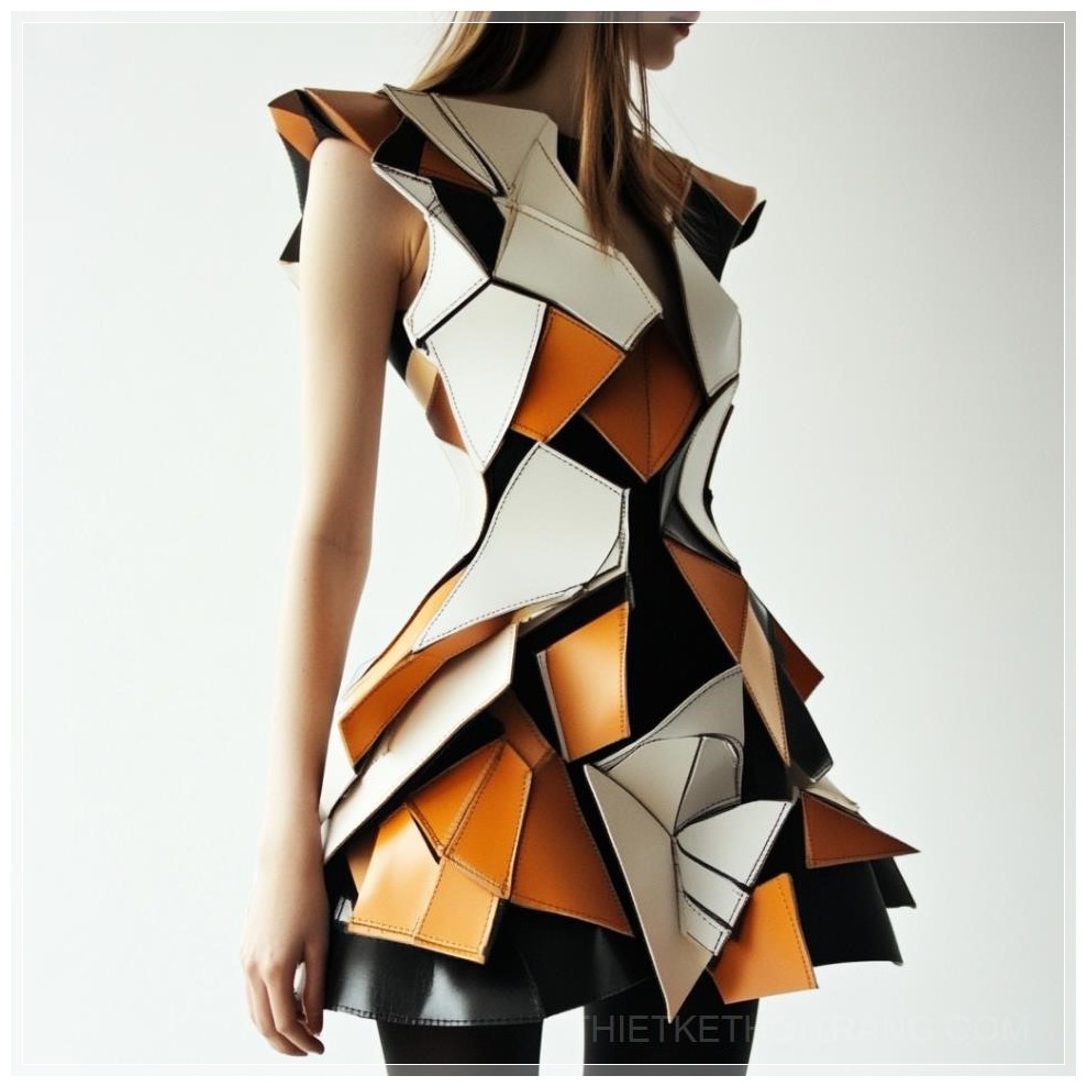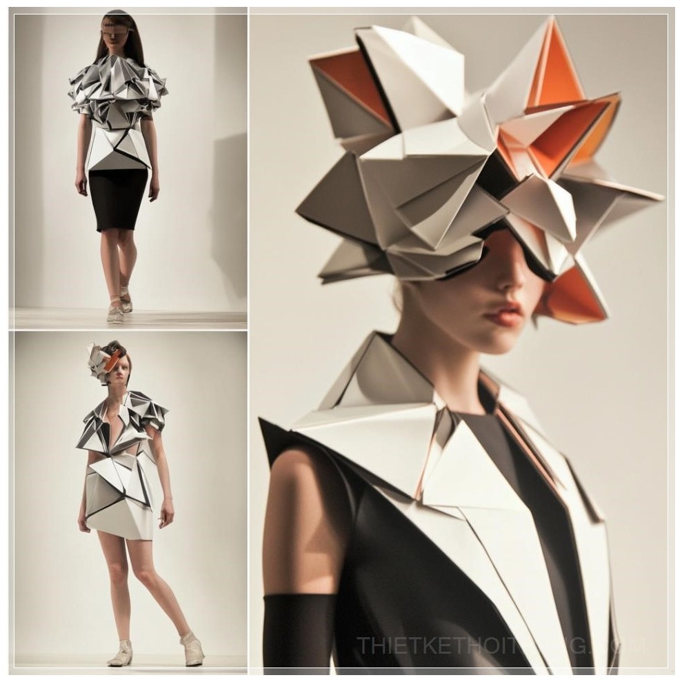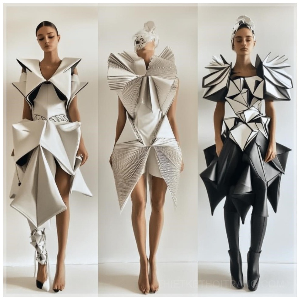 PROMPT: structural fashion design pieces with 3 dimensional geometric but abstract shapes, 5 looks --v 6.1 Ý Nghĩa: Những bộ trang phục thiết kế với hình khối hình học ba chiều nhưng mang tính trừu tượng, gồm 5 phong cách khác nhau.