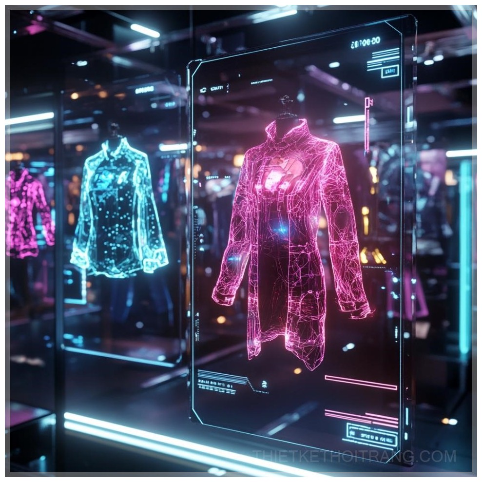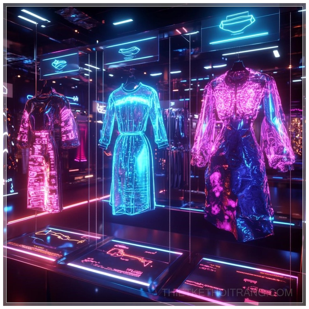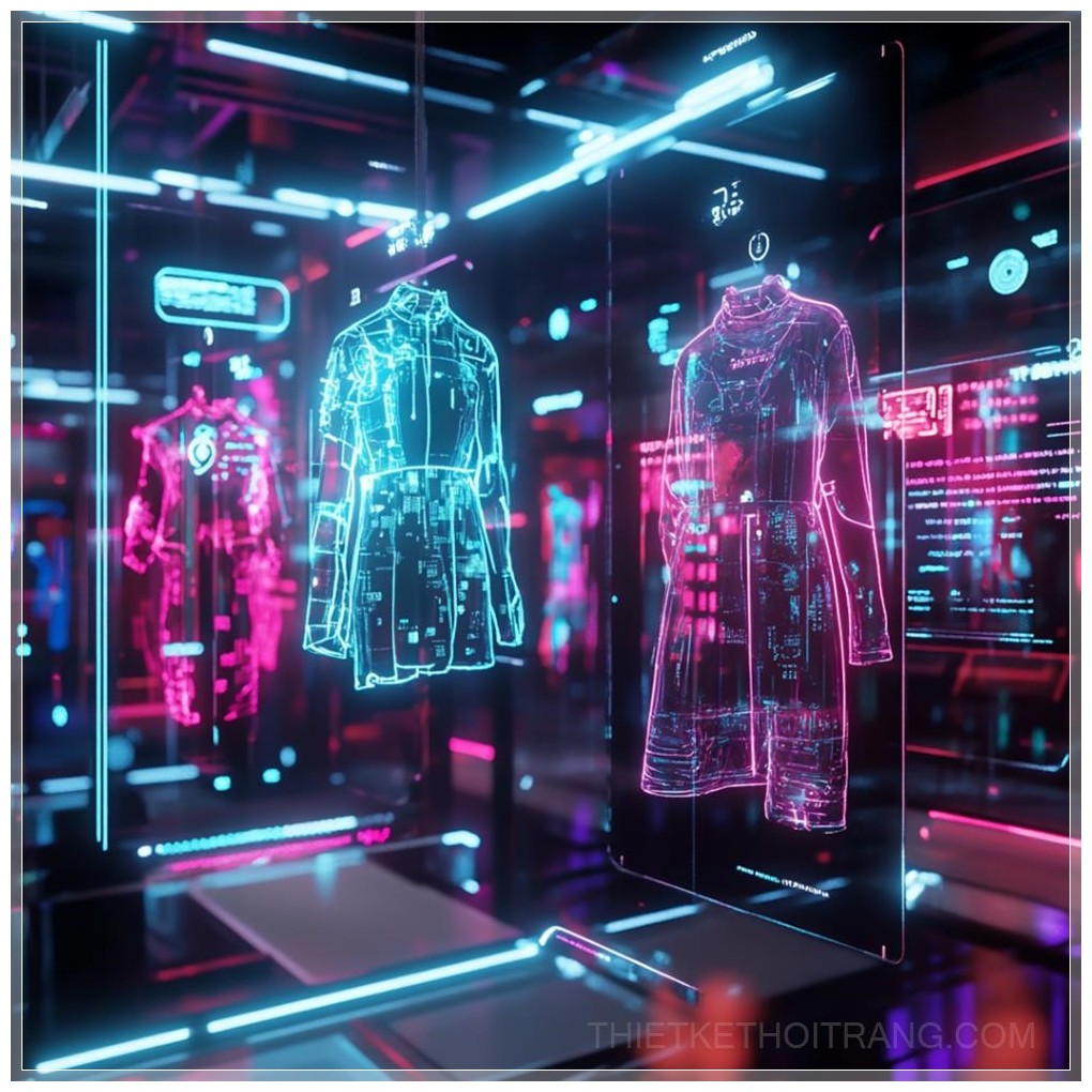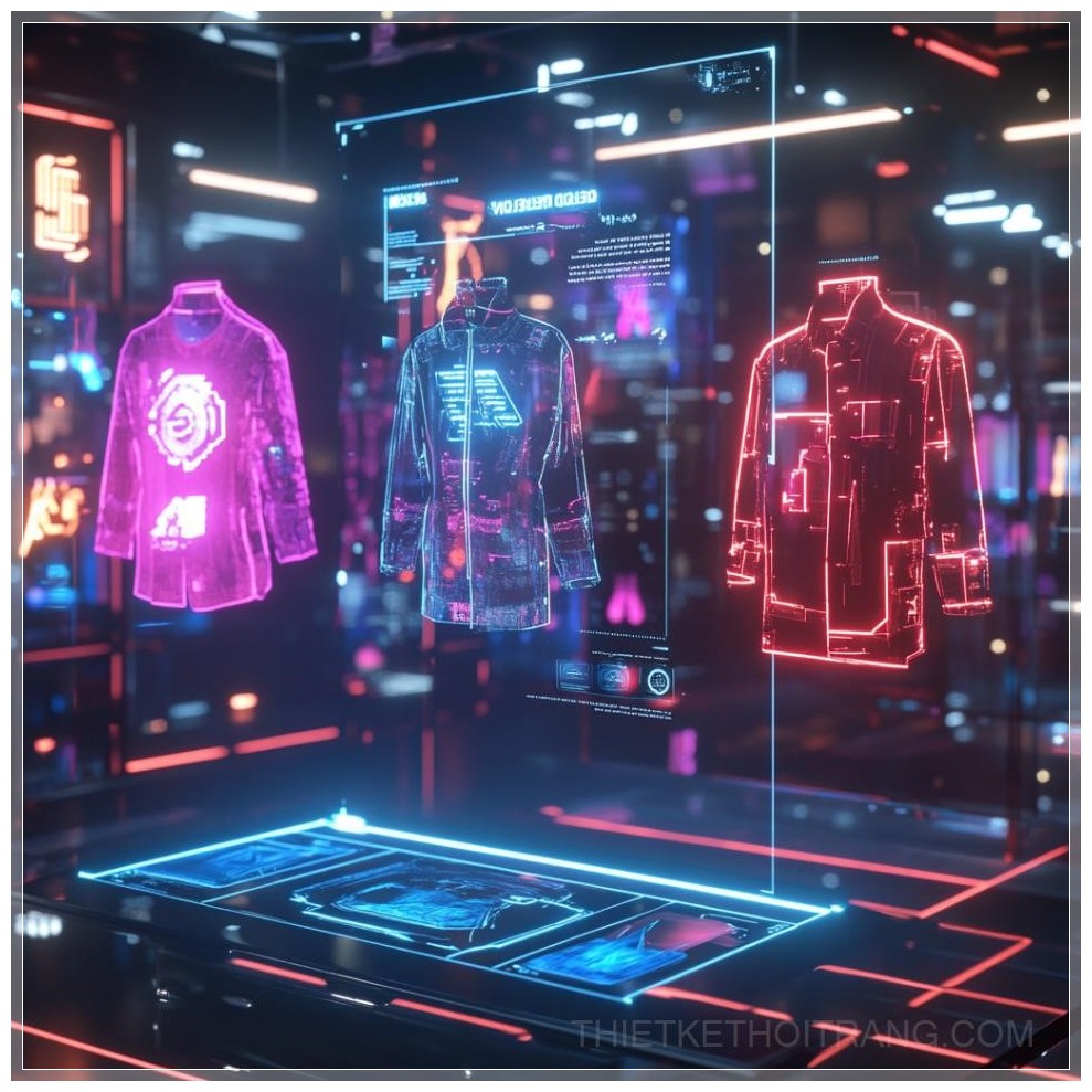 Giao diện mua sắm AR tương lai trưng bày trang phục ảo qua những màn hình sống động. Hình ảnh động làm nổi bật chi tiết của các bộ trang phục khi chúng nổi và xoay trong một không gian hiện đại, công nghệ cao. Cảnh vật mang phong cách hiện đại với các điểm nhấn neon phát sáng và sự tương tác mượt mà, nhấn mạnh sự đổi mới và công nghệ tiên tiến đằng sau trải nghiệm mua sắm.