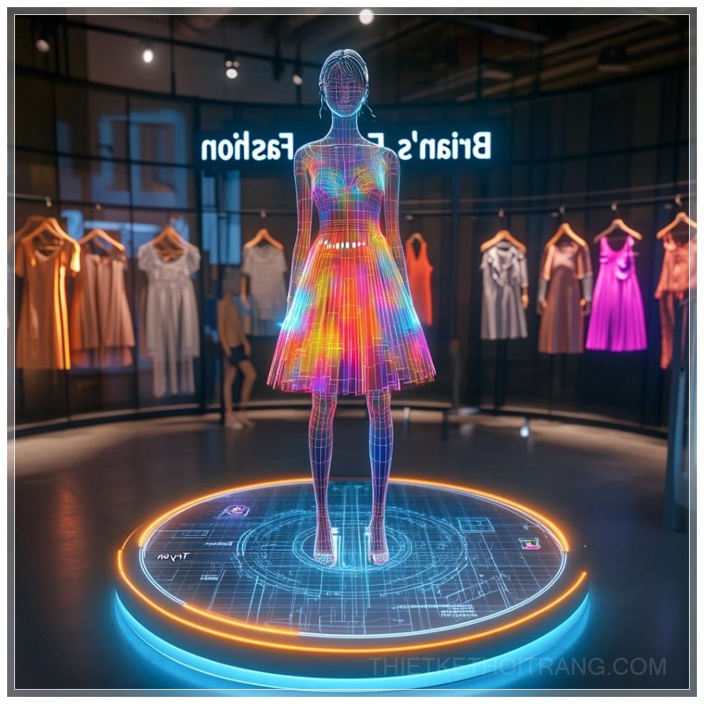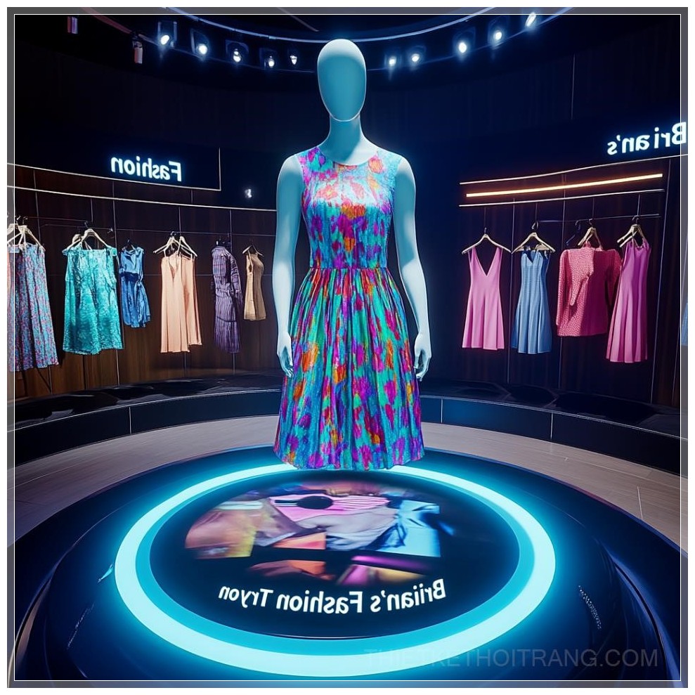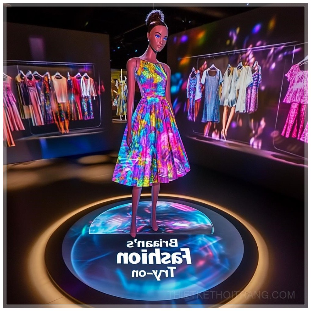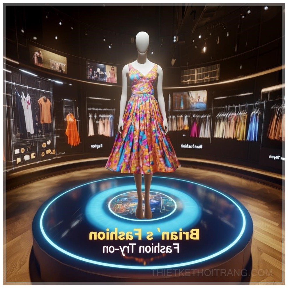 Một gian hàng tròn với mô hình số AR mặc một chiếc váy đầy màu sắc, xung quanh là các móc treo và tường trưng bày ảo ở phía sau. Dòng chữ "Brians Fashion Try-on" xuất hiện ở trung tâm dưới của cảnh. Phía trước là màn hình cảm ứng tròn holographic hiển thị các kiểu dáng khác nhau để người dùng thay đổi diện mạo. Ánh sáng studio sáng chiếu sáng các màu sắc của chiếc váy và hình dáng con người.