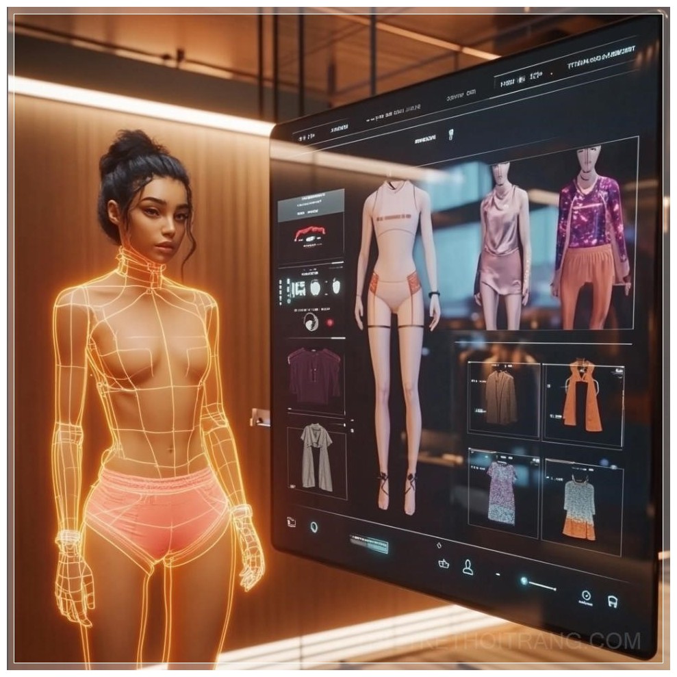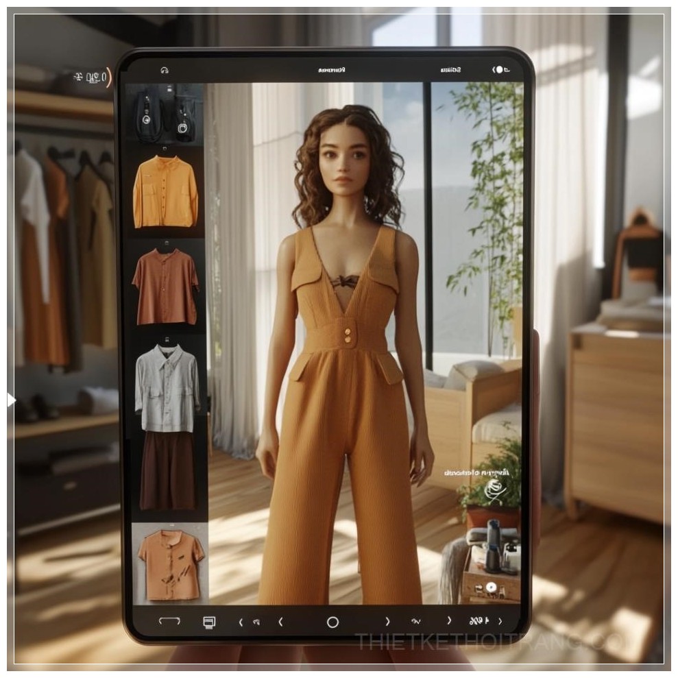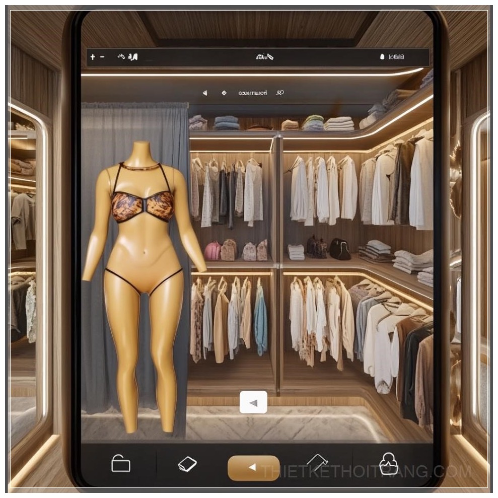 PROMPT: virtual dressing room with avatar on right side add scroll wheel of clothing options and selection method --v 6.1 Ý Nghĩa: Phòng thay đồ ảo với avatar ở phía bên phải, thêm bánh xe cuộn để chọn trang phục và phương pháp lựa chọn.