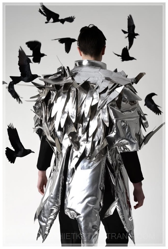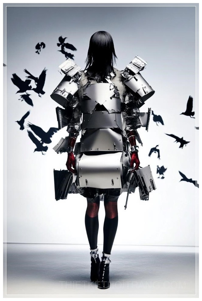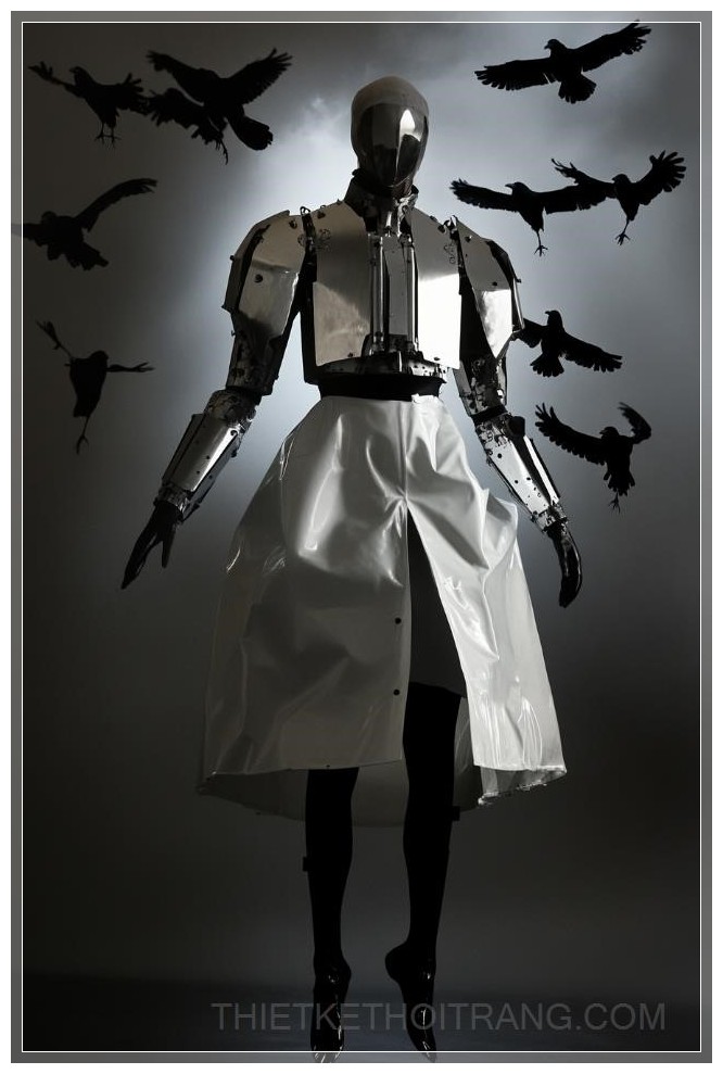 Thiết kế một nhân vật trong bộ trang phục cô dâu tương lai kết hợp các yếu tố thẩm mỹ công nghệ cao, với các mảnh kim loại gắn vào áo khoác phồng quá khổ có đường cắt hiện đại, lộ một phần eo. Phong cách của Alexander McQueen, bộ giáp kim loại vừa có tính năng vừa thẩm mỹ, bao gồm pauldron, bọc tay, và ủng. Tổng thể thiết kế mang tính tương phản tinh tế, hòa quyện giữa yếu tố tự nhiên và nhân tạo. Phông nền bao gồm một đàn quạ bay lượn, ánh sáng tạo không gian u tối, tập trung vào sự tương tác giữa ánh sáng và bóng tối.