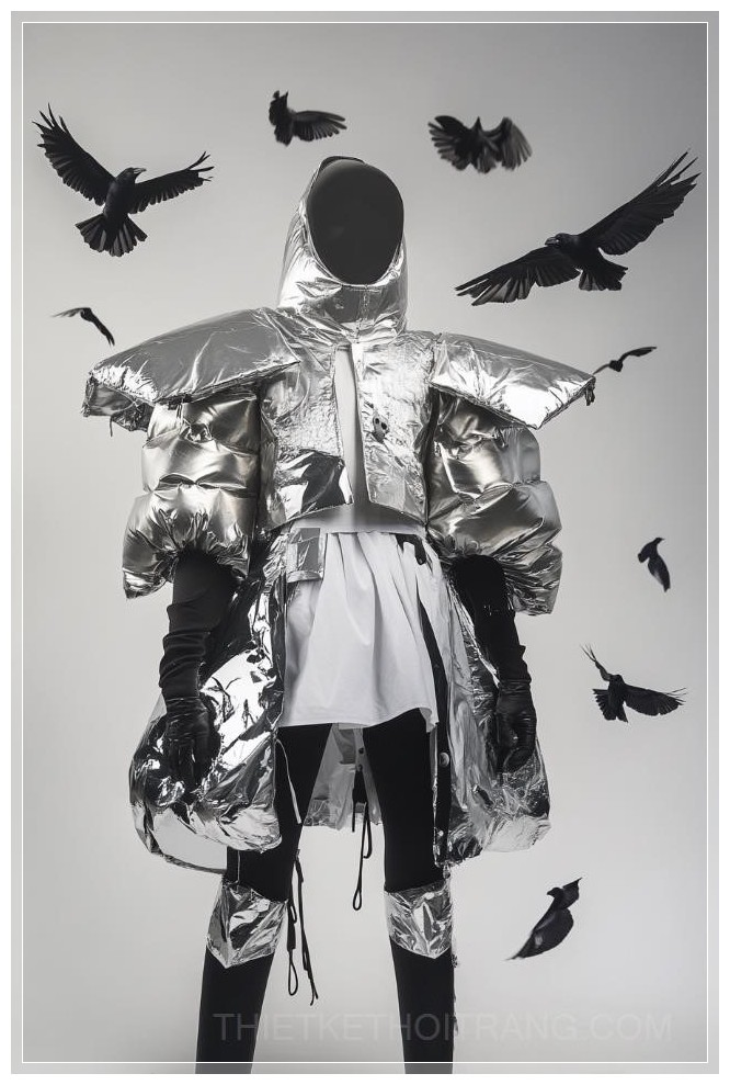 Design a character in a futuristic bridal ensemble that combines elements with high-tech aesthetics,metal segments are attached to oversized puffe inflatable coat with a modern cropped cut that reveals a sliver of the waist., in the style of Alexander McQueen,a set of metallic armor that is both functional , pauldrons, bracers, and greaves.The overall aesthetic should be one of elegant contrast, blending the organic and the synthetic, The backdrop should include a flock of crows in flight, The lighting should be moody and focused, focus on the interplay of light and shadow --v 6.1 --s 15 --ar 2:3