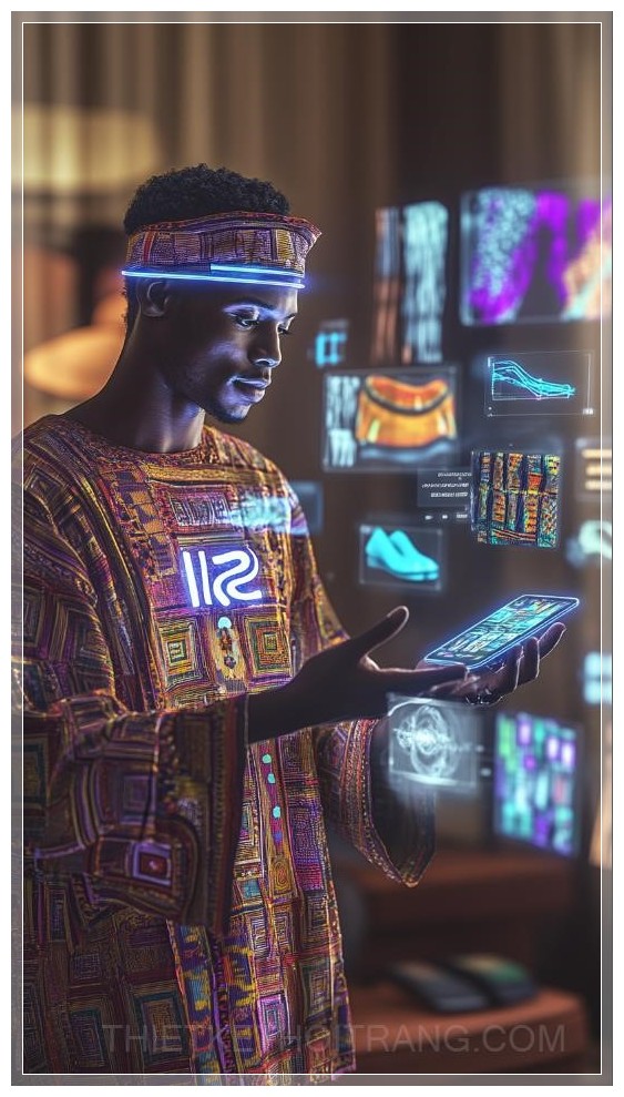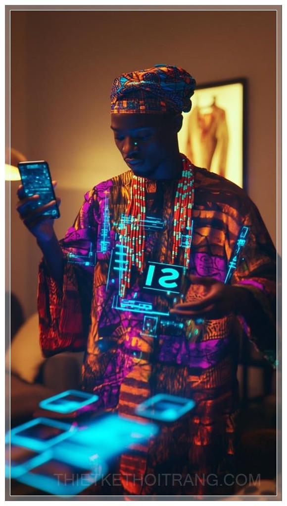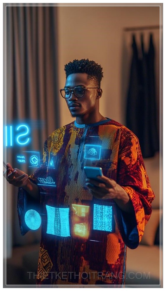 African Men standing wearing native attire and touching the dashboard, holding his phones in one hand and wearing Nigeria native attire with bold SI illuminating on his native attire. The background is a living room with soft holographic lighting. they are looking at an app that has various kinds of cloth floating above it. One of these is a native wear and another shows images of different types of cloths like mask to artificial intelligence technology in the style of SydneyMade on Satellite . characteristics are seen around them as they uses digital technology. --ar 9:16