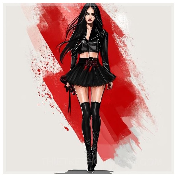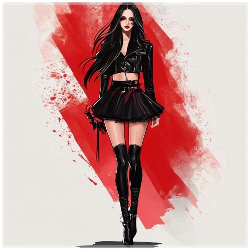 Minh họa thời trang toàn thân, thiết kế thời trang, hình ảnh toàn thân, người mẫu nữ xinh đẹp và ấn tượng, người mẫu nữ cao, trang phục nữ, phác thảo thiết kế thời trang, hình ảnh vector, màu sắc chủ đạo đen, phối hợp với đỏ, chủ đề phong cách tối tăm của công nghệ tương lai, sử dụng các chất liệu như da, lụa, ren và các vật liệu khác, phụ kiện hình sọ hoa hồng, váy dài, tóc đen dài.