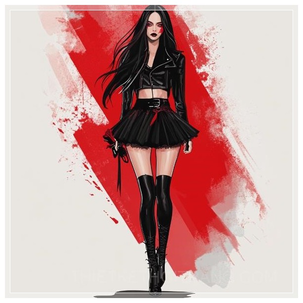 Full body fashion illustration, fashion design, fashion design, full body image, handsome and beautiful female model, tall female model, women's clothing, fashion design sketch, vector image, main color black, paired with red, theme of dark style of future technology, using leather, silk, lace and other materials, rose skull accessories, long skirt, black long hair ,--ar16:9 ,--iw2 ,