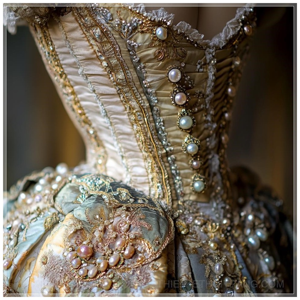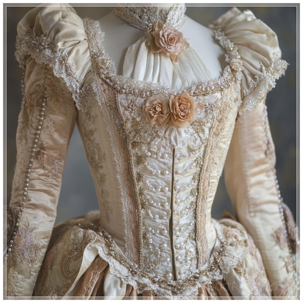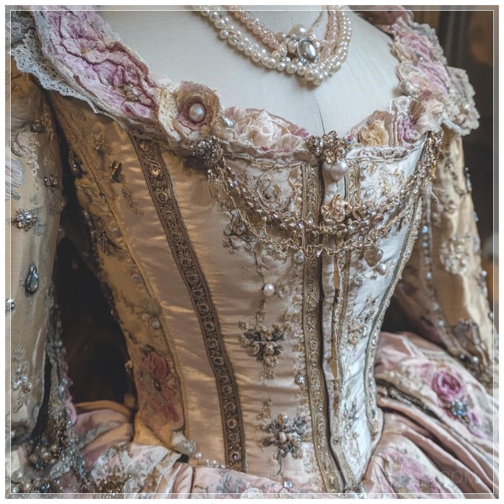 PROMPT: Costume Marie-Antoinette Versailles, perles, courte Ý Nghĩa: Trang phục Marie-Antoinette từ Versailles, với chi tiết ngọc trai và thiết kế ngắn.