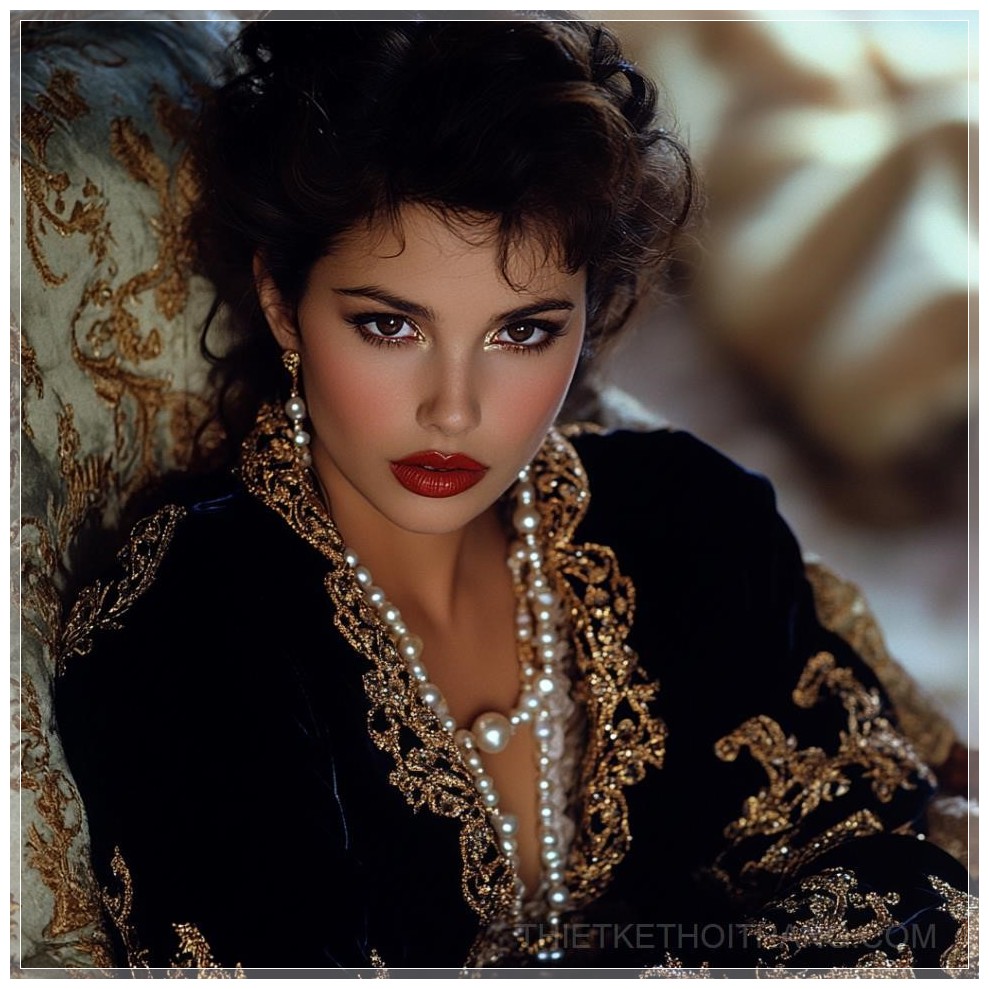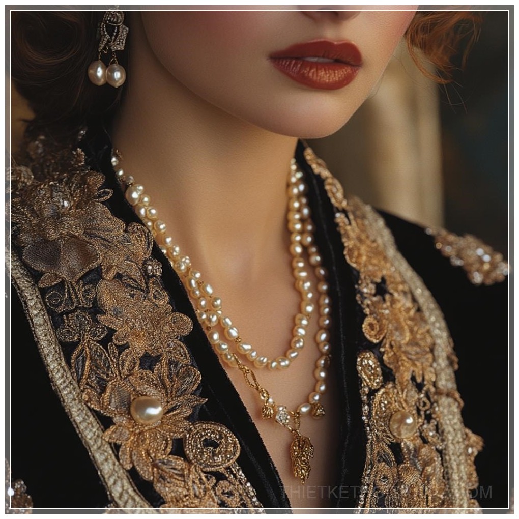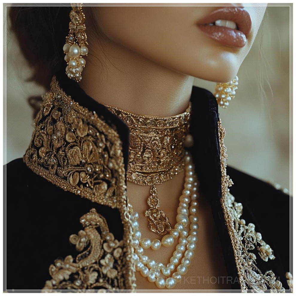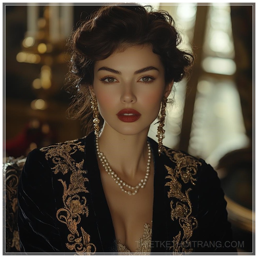 PROMPT: cinematic scene from gua ulds movie, woman wearing a velvet jacket with golden embroidered and pearls jewelry --s 250 --v 6.1 --style raw Ý Nghĩa: Một người phụ nữ mặc áo khoác nhung thêu vàng và trang sức ngọc trai.