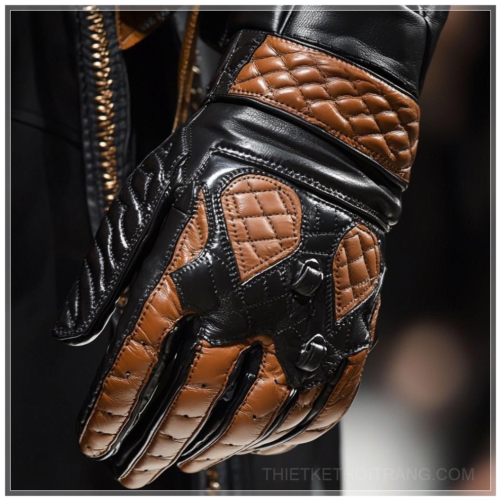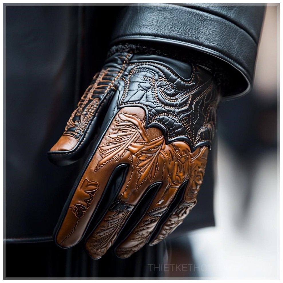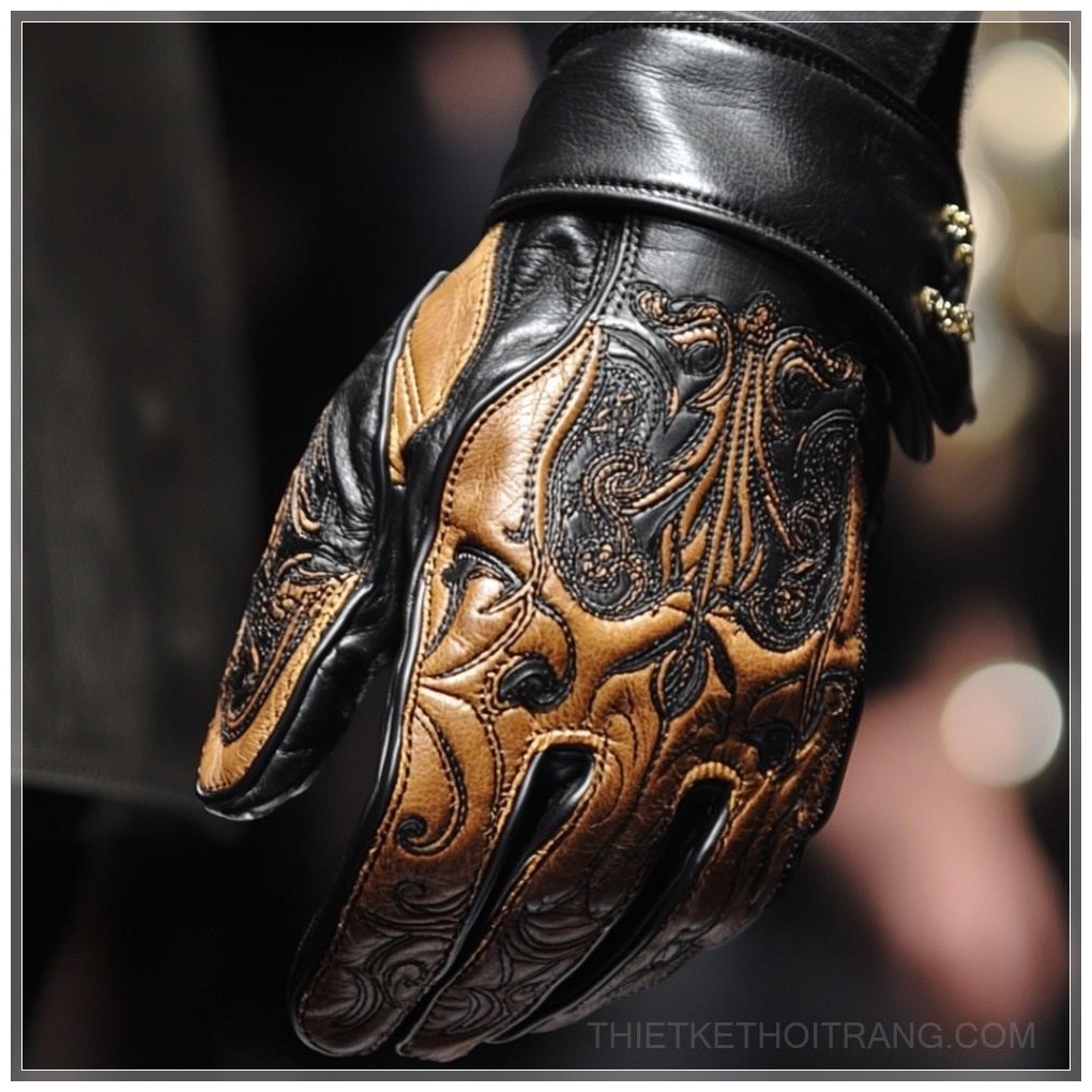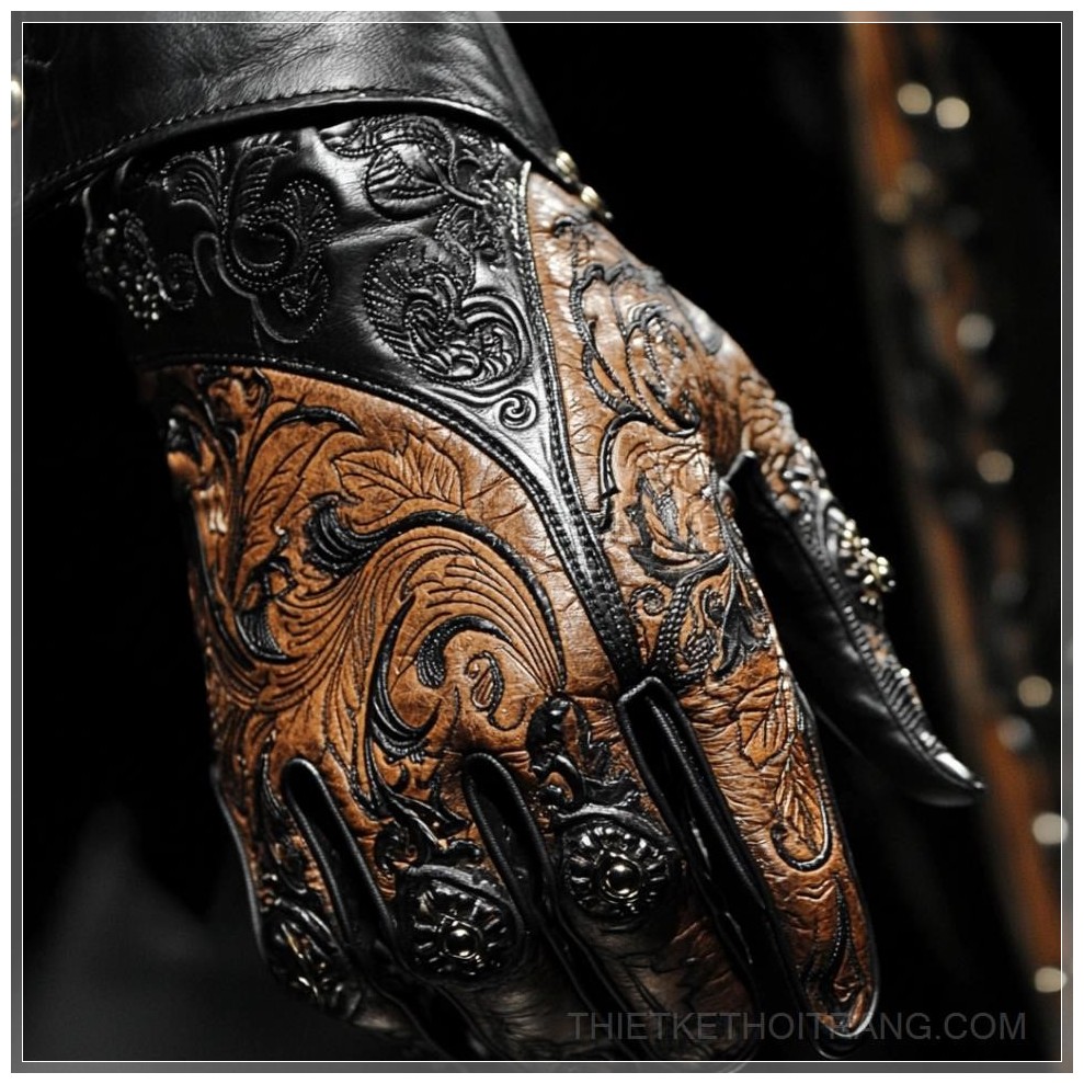 PROMPT: high fashion runway wild west cowboy leather gloves, close up, balenciaga, black and brown leather, embossing, --q 2 Ý Nghĩa: Găng tay da cao cấp phong cách cao bồi miền Tây, cận cảnh, Balenciaga, da đen và nâu, họa tiết dập nổi.