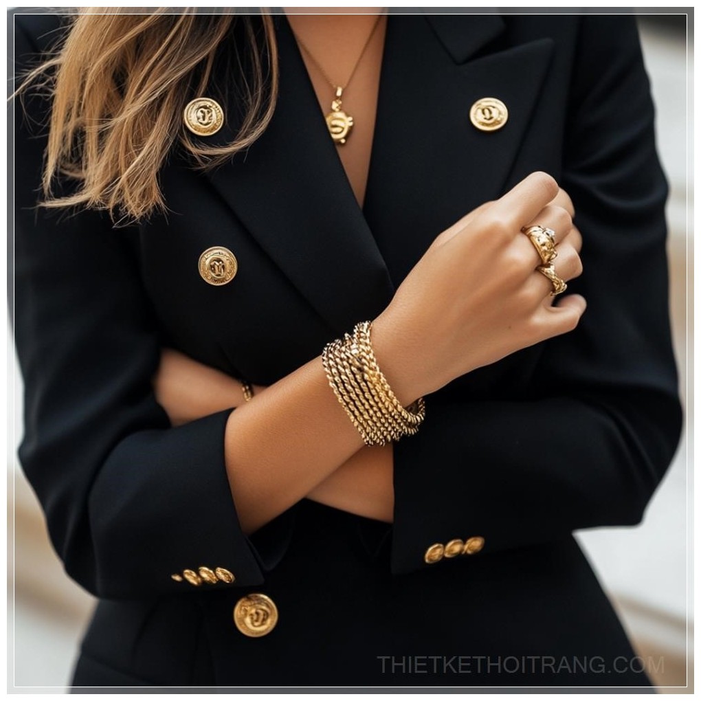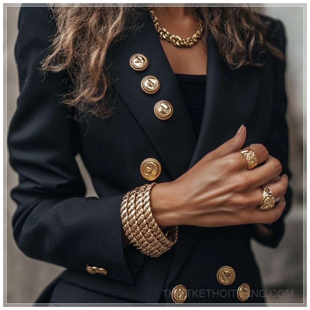PROMPT: Close up shot of arms, vintage Chanel gold metal buttons on a black blazer with bracelets in hand. --ar 1:1 --v 6.1 --style raw Ý Nghĩa: Cận cảnh cánh tay với những chiếc nút kim loại vàng của áo blazer đen và những chiếc vòng tay trên tay.