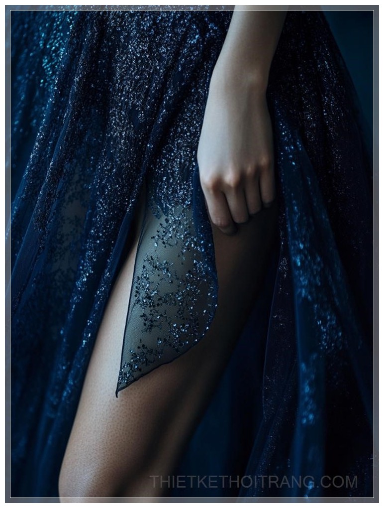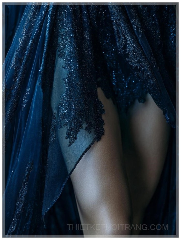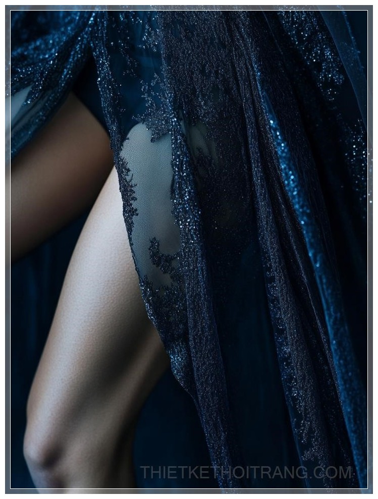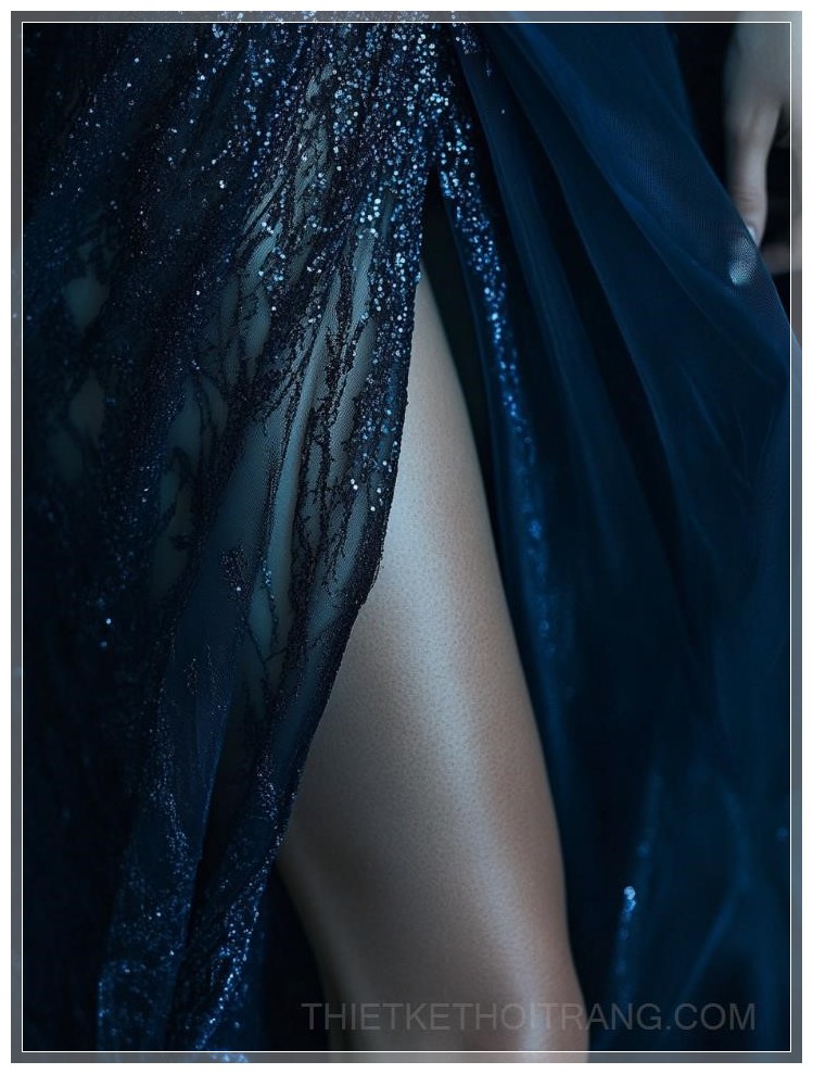 Cận cảnh cực gần của một chiếc váy dạ hội cao cấp với đường xẻ cao, màu xanh đêm huyền bí, ánh sáng studio mềm mại, tập trung vào kết cấu vải tinh xảo và ánh nhũ nhẹ nhàng, có cảm giác chuyển động, không nhìn thấy mặt nhưng lộ một phần đùi và chân, phong cách điện ảnh và thanh lịch.