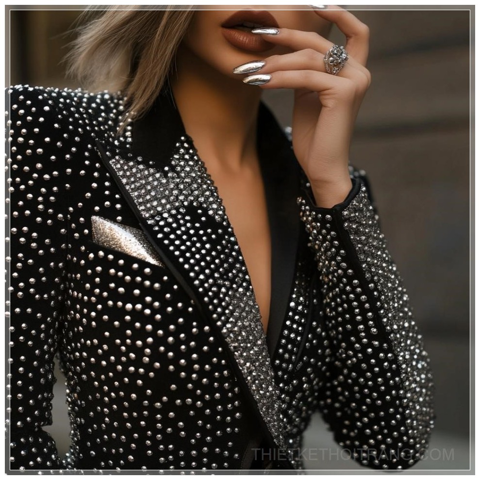 PROMPT: A scorpio corporate woman in a black silver studded blazer, silver nails, luxury --v 6.1 Ý Nghĩa: Một phụ nữ thuộc cung Bọ Cạp, mặc vest đen đính kim loại bạc, móng tay bạc, toát lên vẻ sang trọng và quyền lực.