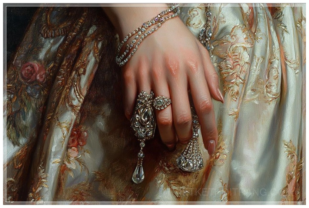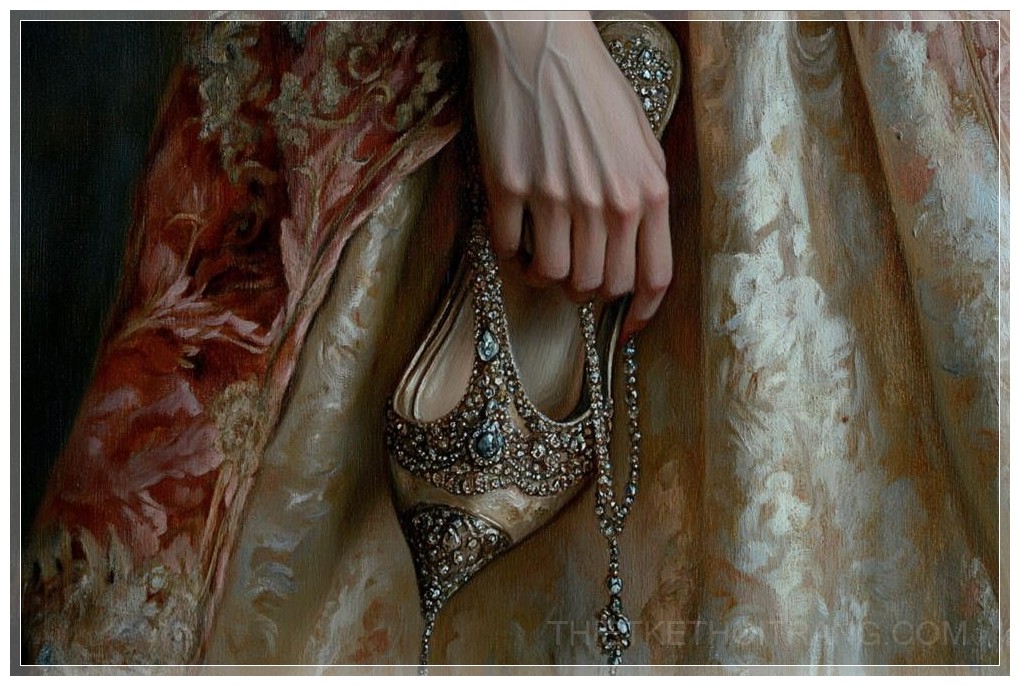 Chân dung cận cảnh của một bàn tay phụ nữ cầm đôi giày cao gót với những viên đá quý, đôi giày treo lủng lẳng từ tay cô ấy. Cô ấy mặc một chiếc váy dài bằng lụa đẹp, hình ảnh được chụp từ eo xuống, theo phong cách của một bức tranh sơn dầu tinh tế.