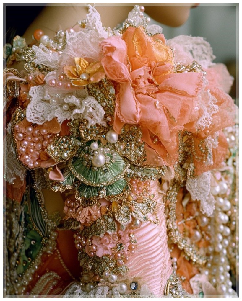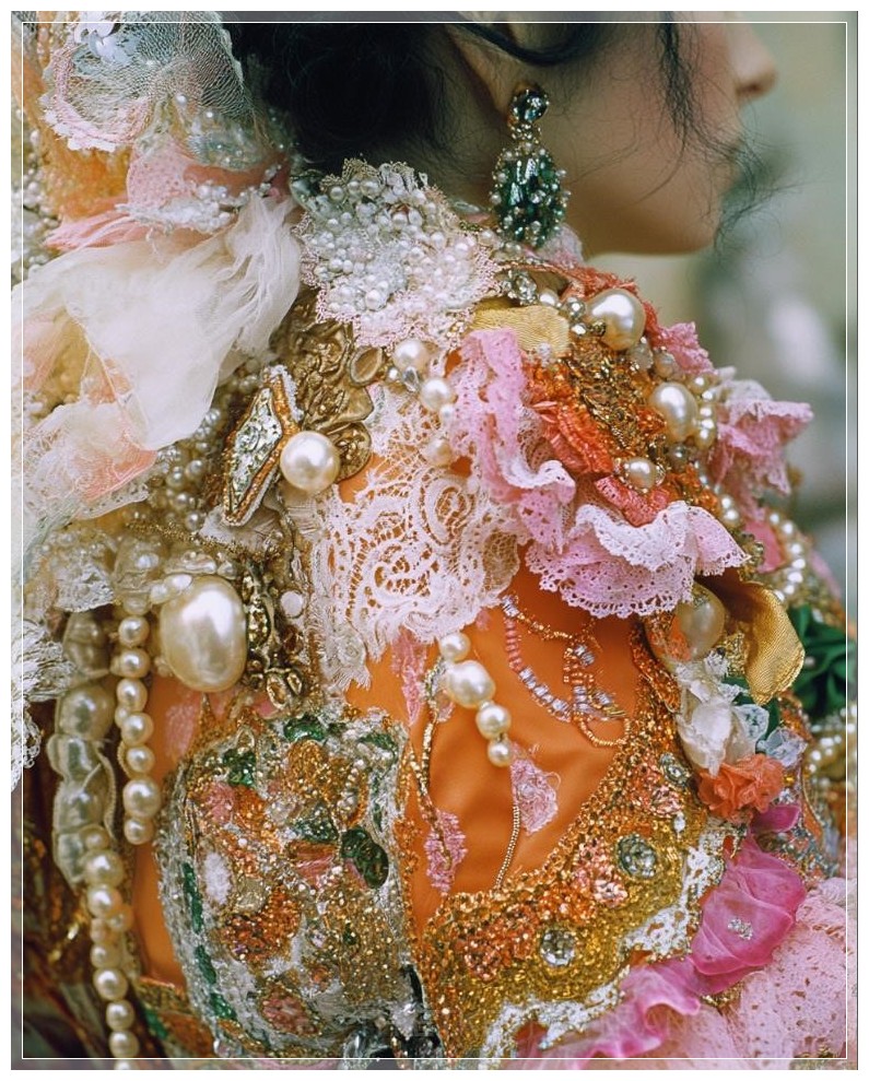 Bức ảnh được chụp bằng máy ảnh phim 35mm, ghi lại cảnh cận cảnh của một người mặc trang phục công phu với những chi tiết tinh xảo. Trang phục này là sự kết hợp màu sắc tươi sáng như hồng, cam, vàng và xanh, với các chất liệu như ren, vải xếp nếp và sequin. Ngọc trai và các chi tiết trang trí khác làm tăng thêm vẻ sang trọng và nghệ thuật. Người mẫu quay nhẹ sang một bên, tóc xoăn tự nhiên, tạo nên vẻ thanh lịch cho cảnh vật.