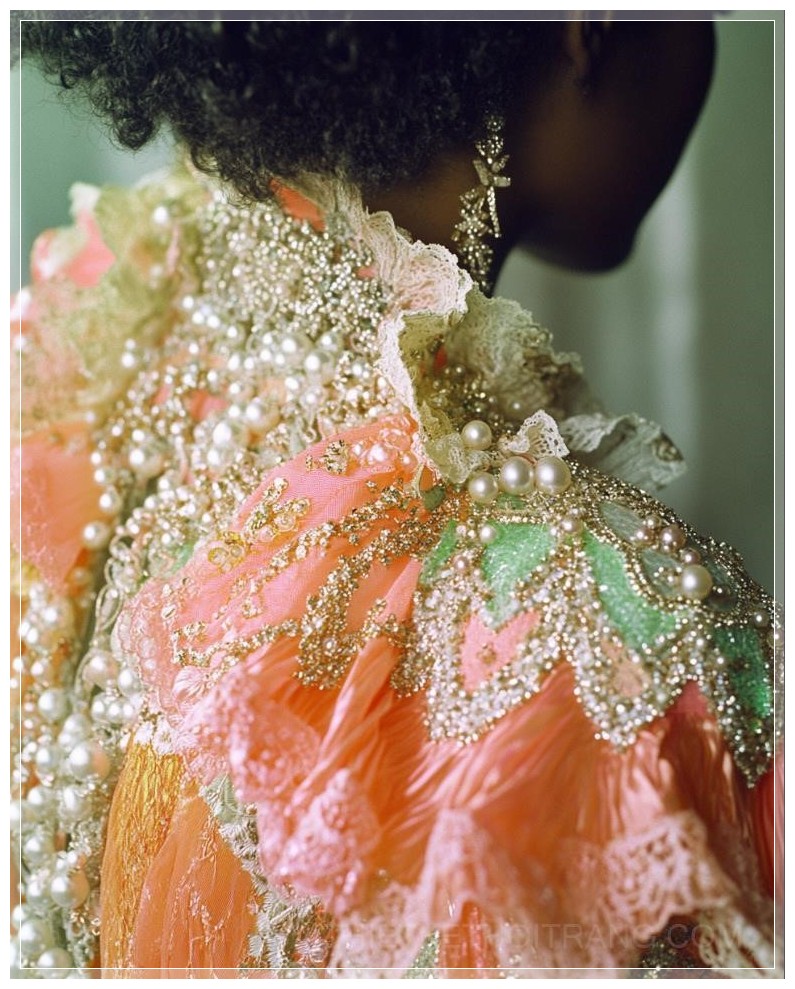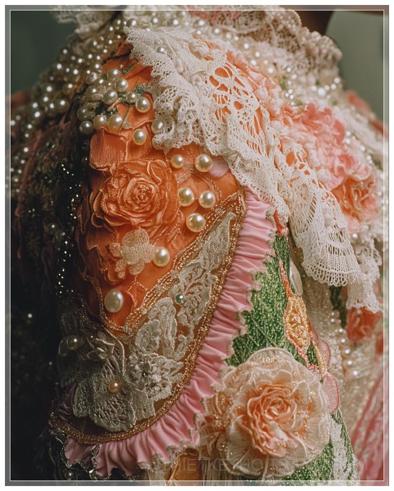 This photograph was taken with a 35mm film camera. The image features a close-up of a person wearing an elaborate garment adorned with intricate details. The garment is a vibrant display of colors, including pink, orange, gold, and green, with a mix of textures such as lace, ruffles, and sequins. Pearls and other embellishments add a luxurious touch, creating a sense of opulence and artistry. The person is turned slightly away, with their hair styled in a natural, curly fashion, adding to the overall elegance of the scene. The focus is on the garment's craftsmanship, highlighting the creativity and skill involved in its design. The background is minimal and out of focus, ensuring that the attention remains on the garment's striking features. --ar 4:5 --v 6.1