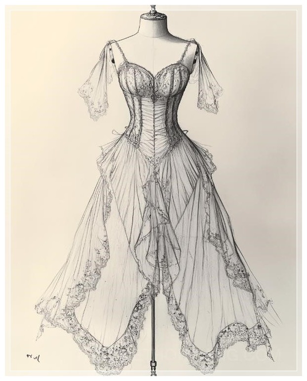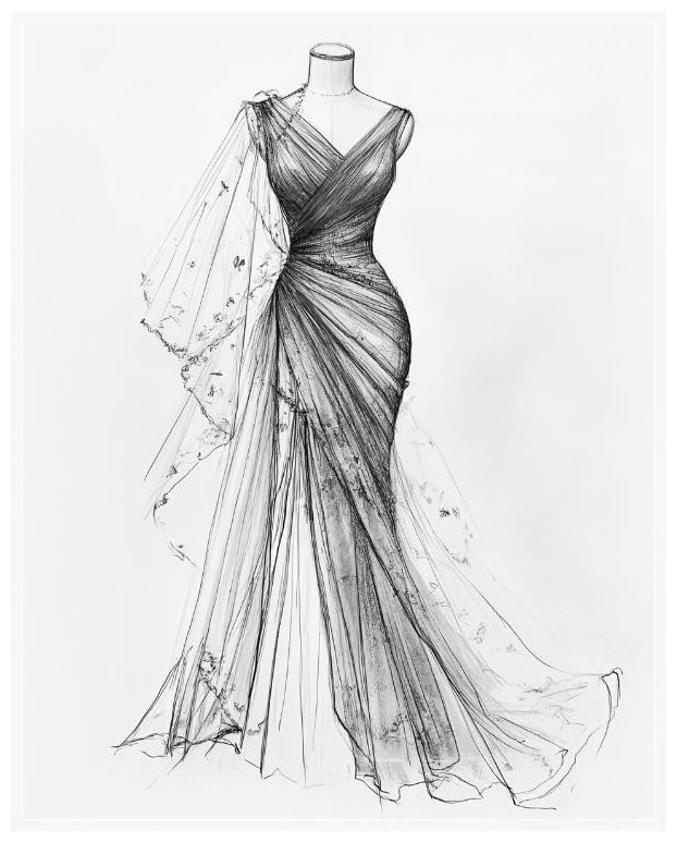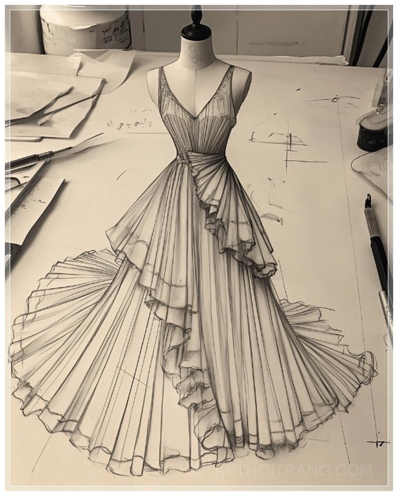 PROMPT: sketch of ethereal goddess gown on sewing form --ar 4:5 Ý Nghĩa: Một phác thảo thiết kế của chiếc áo choàng nữ thần ethereal được vẽ trên mannequin may đồ, thể hiện sự tinh tế và huyền bí trong từng chi tiết của bộ trang phục.