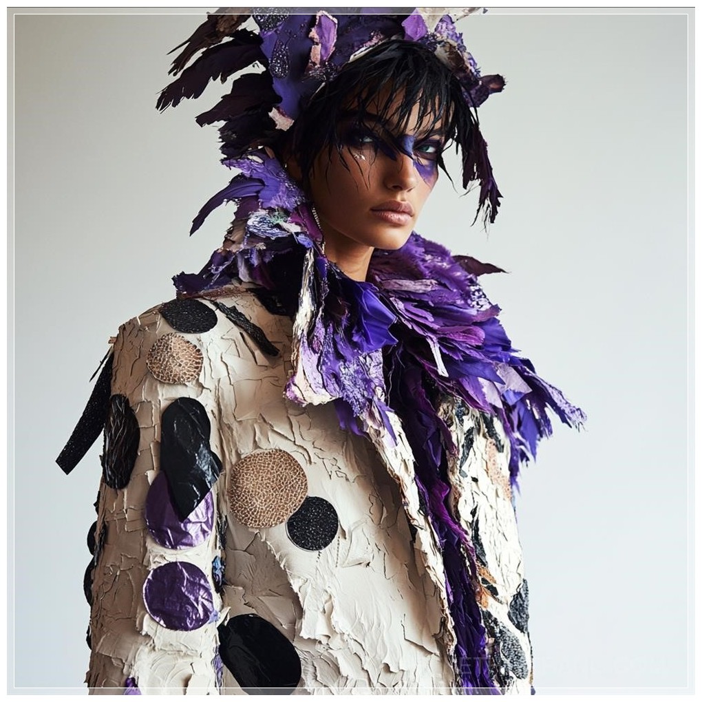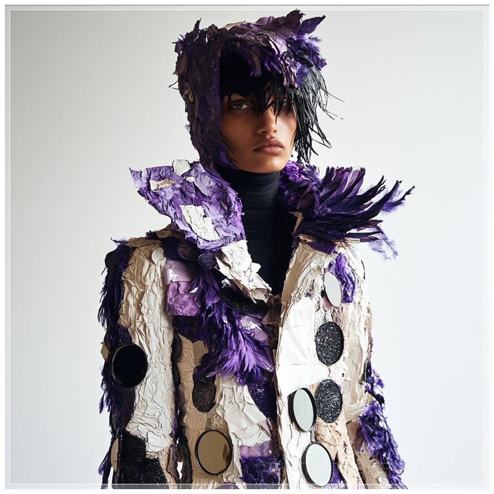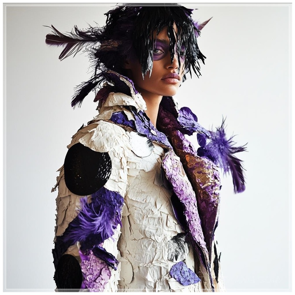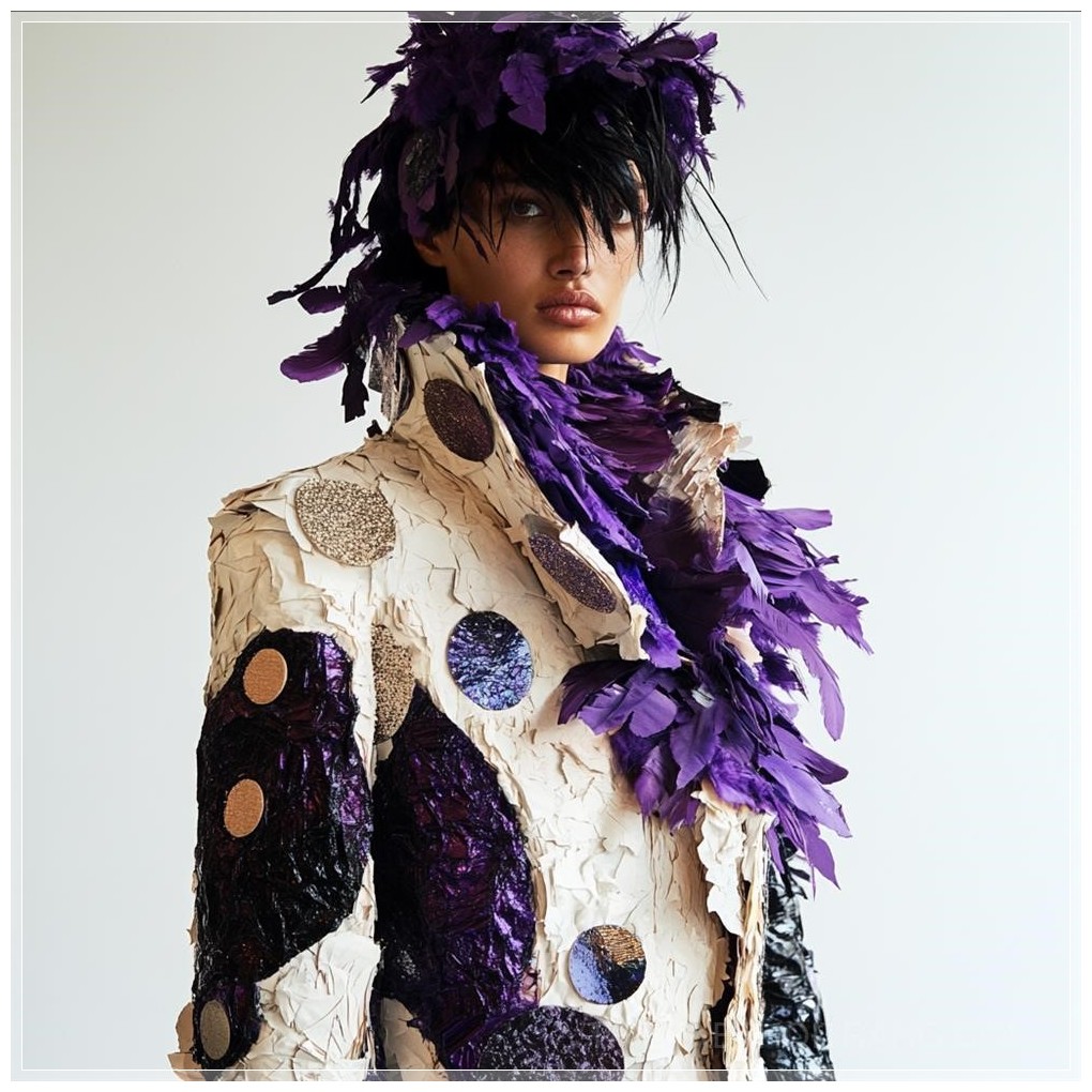 a model wears a jacket in the style of chanel made from tissue paper, leather circles, purple ostrich feathers and broken mirror shards --v 6.1